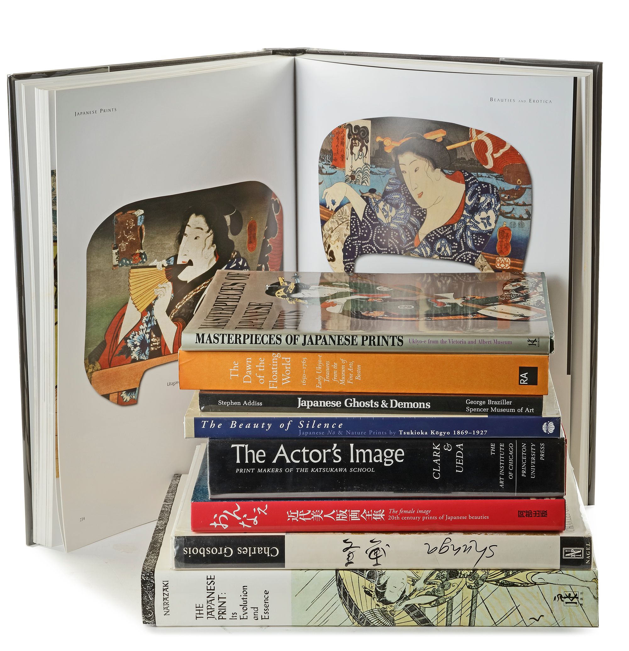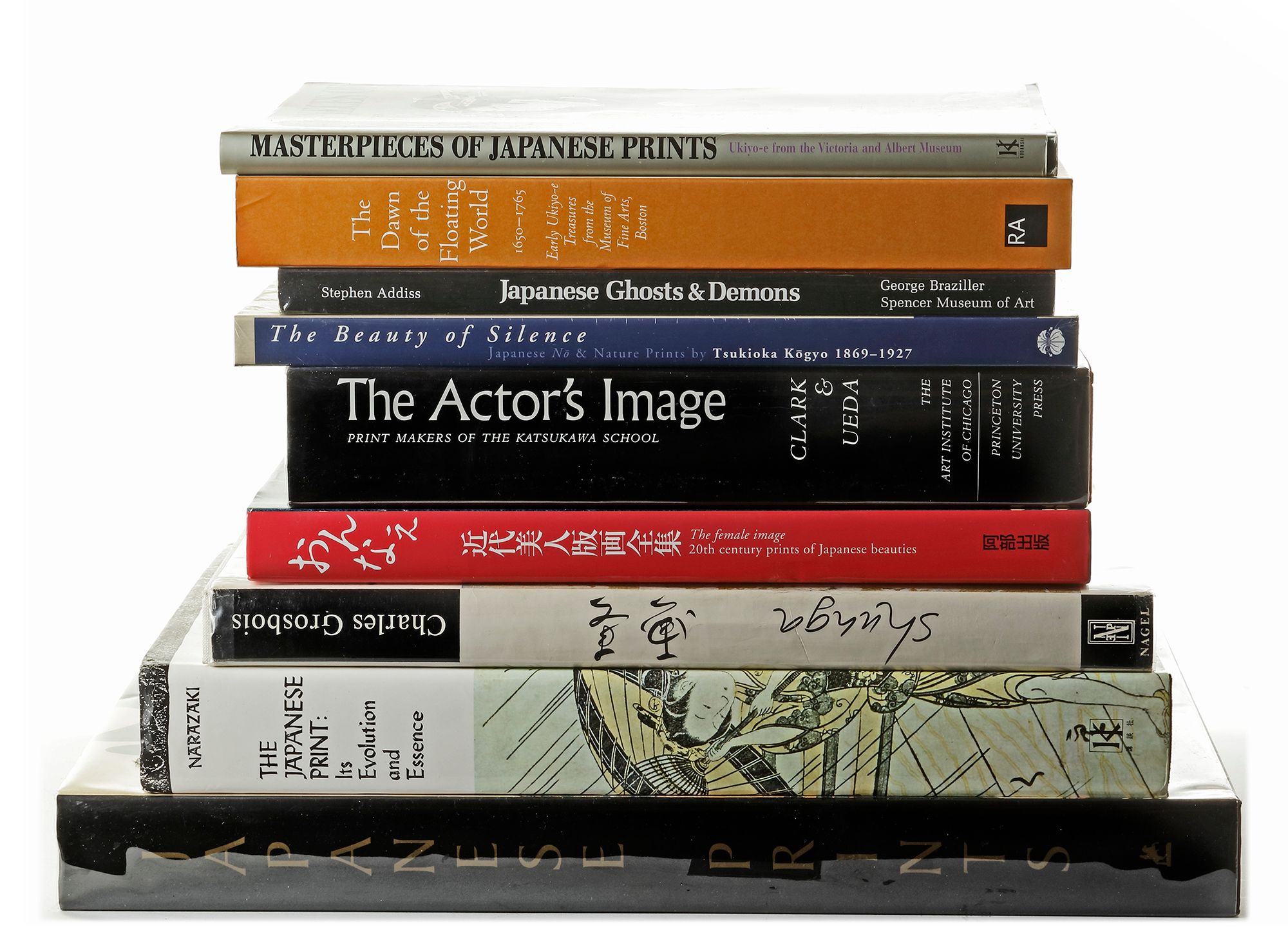 "Narazaki, Muneshige. The Japanese Print: Its Evolution and Essence. Tokyo: Kodansha, 1966. First Edition. 274 Pages, 107 tipped-in colour plates, bibliography, glossary, index. Original slipcase. This book introduces the reader to the aesthetics and techniques of Japanese prints, including a chapter on collecting prints. All plates in colour with full descriptions and a note on the artist. English adaptation by C. H. Mitchell. A masterpiece! Robert Schaap & J. Thomas Rimer. The Beauty of Silence - Japanese No & Nature Prints by Tsukioka Kogyo - 1869 – 1927. Leiden: Hotei, 2010. First Edition. 192 pages, text in English, full colour images throughout. The Beauty of Silence. Japanese No and Nature Prints by Tsukioka Kogyo (1867-1927) is the first monograph in English on Tsukioka Kogyo, one of the lesser-known exponents of Japanese woodblock prints of the Meiji period (1868-1912). This publication exposes Kogyo´s life and work, presenting a detailed and abundantly-illustrated overview of his rich oeuvre of prints and paintings, and places them in the context of his times. For the first time, Kogyo´s life and work are accessible to readers throughout the world. Clark, Timothy & others. The Actor's Image: Print Makers of the Katsukawa School. Chicago: Princeton University Press, 1994. First edition. 503 Pages, illustrated in colour and black and white. The ""floating world""--the closely related pleasure and entertainment districts of Tokyo in the eighteenth and nineteenth centuries--embodied and idealized fashion, chic, and urbanity for its habitudes, and inspired a profusion of woodblock prints depicting renowned courtesans and adored matinee idols. Considered ephemera in their time, these prints are treasured works of art today. In this volume of ""floating world prints"" (ukiyo-e), the authors present a selection of Kabuki actor portraits and theatre scenes from The Art Institute of Chicago's world-renowned Buckingham Collection of Japanese Prints. Together with interpretive essays that place the prints in their historical and cultural context, the authors offer a catalogue of 880 prints, 136 of them in colour, containing the most complete and up-to-date information available about each print. Donald Jenkins's essay explains printmaking and explores the lives and milieu of the Katsukawa school print makers. Timothy Clark, in his essay, vividly depicts the world of Kabuki theater and describes a particular production of a popular play, from the vantage points of various participants. Osamu Ueda has provided dates and identification for the subjects of many of the prints in the collection, as well as biographies of the leading Kabuki actors and brief lives of the printmakers of the Katsukawa school Addiss, Stephen. Japanese Ghosts and Demons - Art of the Supernatural. New York: George Braziller, 1985. First edition. 192 Pages, 49 colour and 75 black-and-white illustrations. A fine work on Japanese prints in which ghosts and demons are the main subject. Clark, Timothy & others. The Dawn of the Floating World - 1650-1765: Early Ukiyo-E. Treasures From the Museum of Fine Arts, Boston London: Royal Academy of Arts, 2002. First Edition. 335 pages, text in English. Full colour images as well as black & white. Catalogue to accompany the exhibition. It contained many exquisite pieces from the Museum of Fine Arts in Boston, many of which have never been seen outside the museum. Essays by authorities on the subject attributed to this publication. The floating world is an era in the Japanese wood block prints (1650-1765) that is most known outside of Japan. This exhibition is a perfect overview of the styles, subjects and themes. The essays give laymen and scholar a thorough insight into the development of this art form. Grosbois, Charles. Shunga - Images of Spring. Essay on Erotic Elements in Japanese Art. Geneva: Nagel Publishers, 1964. First edition. 157 Pages, tipped-in colour plates. An excellent book on the subject of erotism in Japanese art. Shinji Hamanaka & Amy Reigle Newland. The Female Image - 20th century prints of Japanese Beauties. Leiden: Hotei Publishing, 2000. First Edition. 215 Pages, many full colour images. Text in English and Japanese. The female image is a comprehensive survey of the genre of bijinga ('prints of beautiful women') produced in the Shin hanga tradition that evolved in the early 20th century. This bilingual (Japanese/English) publication is lavishly illustrated with works from Japanese, European and American public and private collections. Prints by major artists such as Hashiguchi Goyo (1880-1921), Torii Kotondo (1900-76) and Ito Shinsui (1898-1972) are included, as are examples from more obscure print designers which have rarely been reproduced. And 2 other books."
