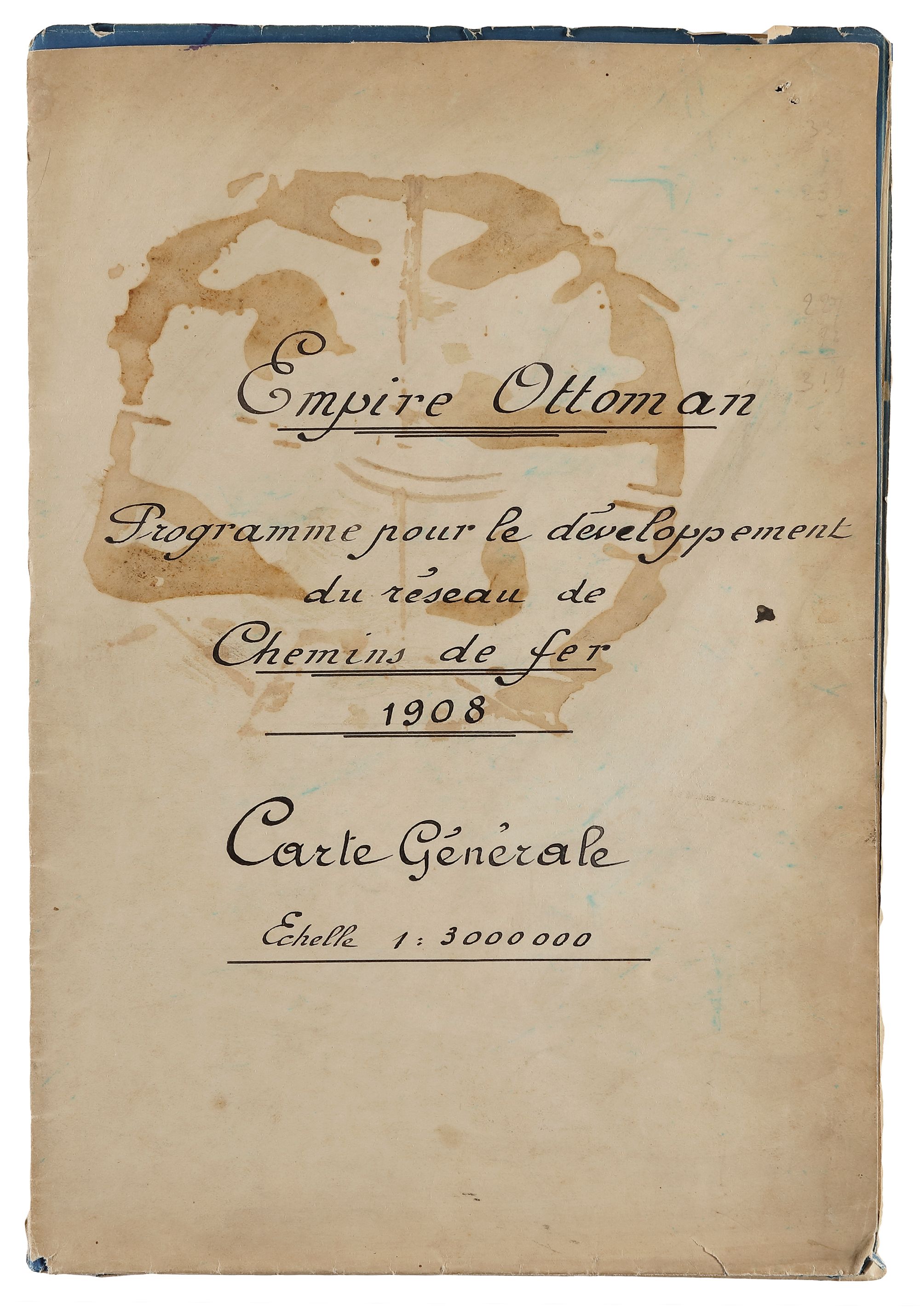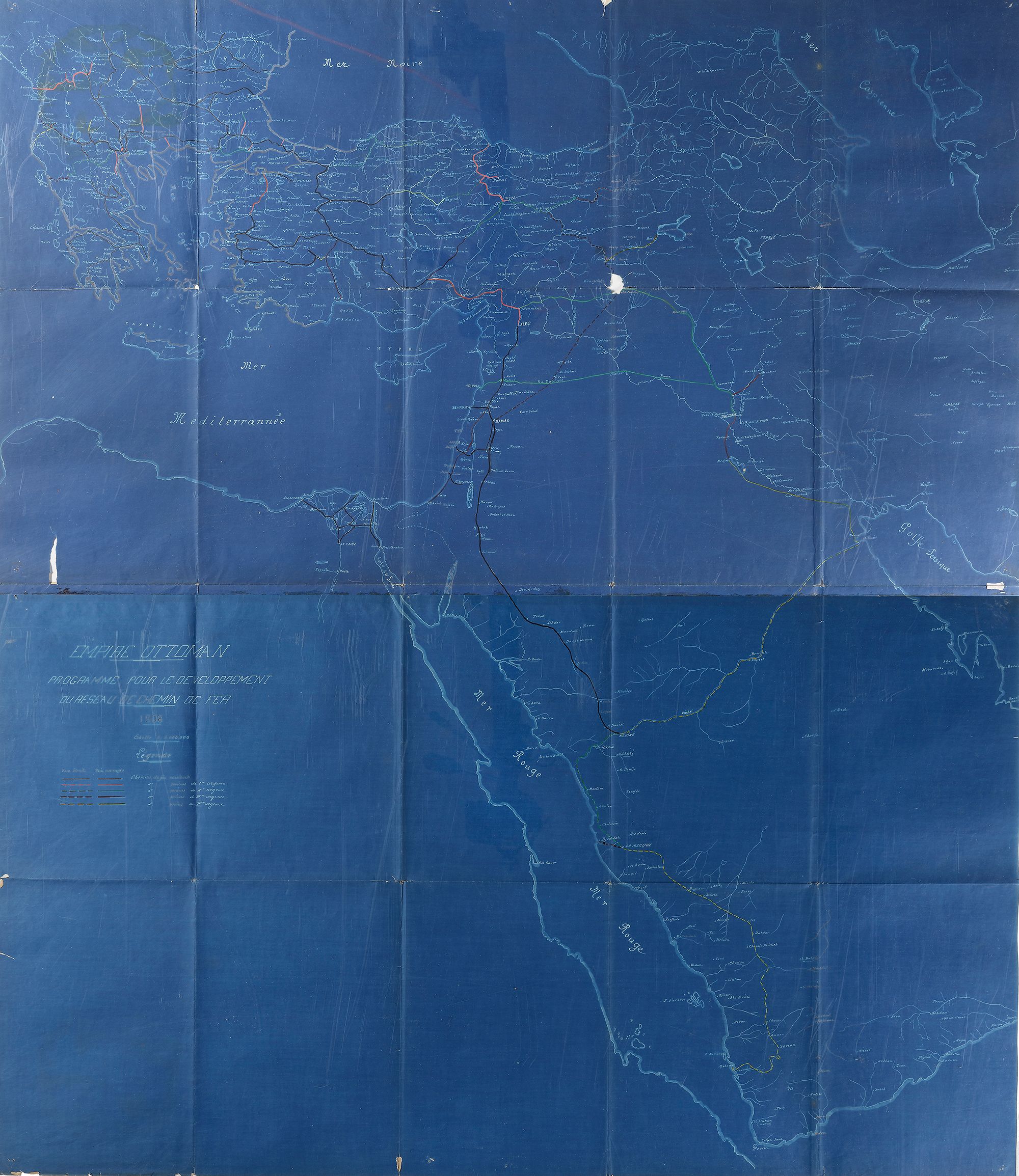 Map (1) A limited-edition blue-colored map regarding the developingprogram of the Ottoman empire’s railroad network, in French with some Ottoman authority’s comments.