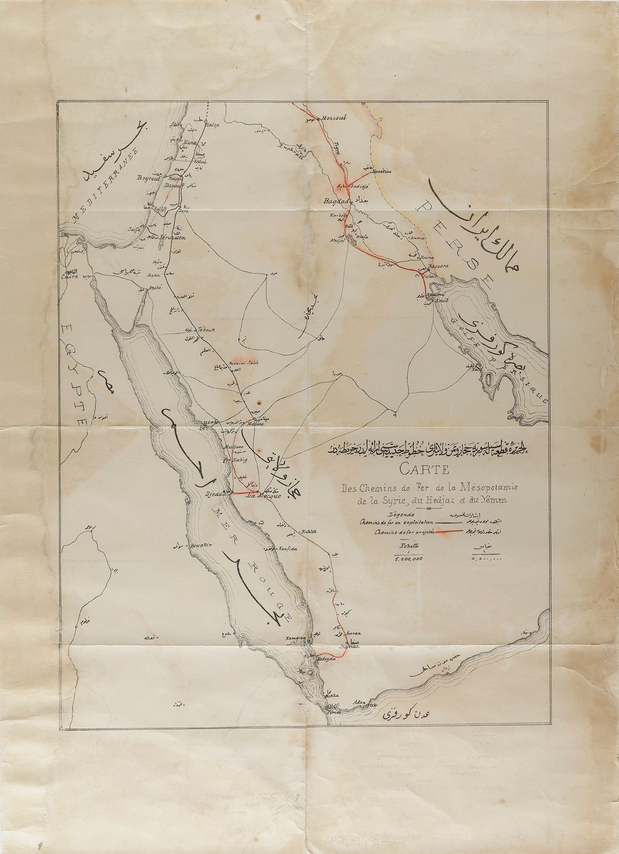 Map (4) Railroad map of Hijaz, Yemen, Syria, and Aljazeera. In French and Turkish, indicating the railroad to Mosul, Baghdad, Basra, and Kuwait plus the connection railroad between Jeddah and Mecca and Mecca and Aseer/Sana’a.