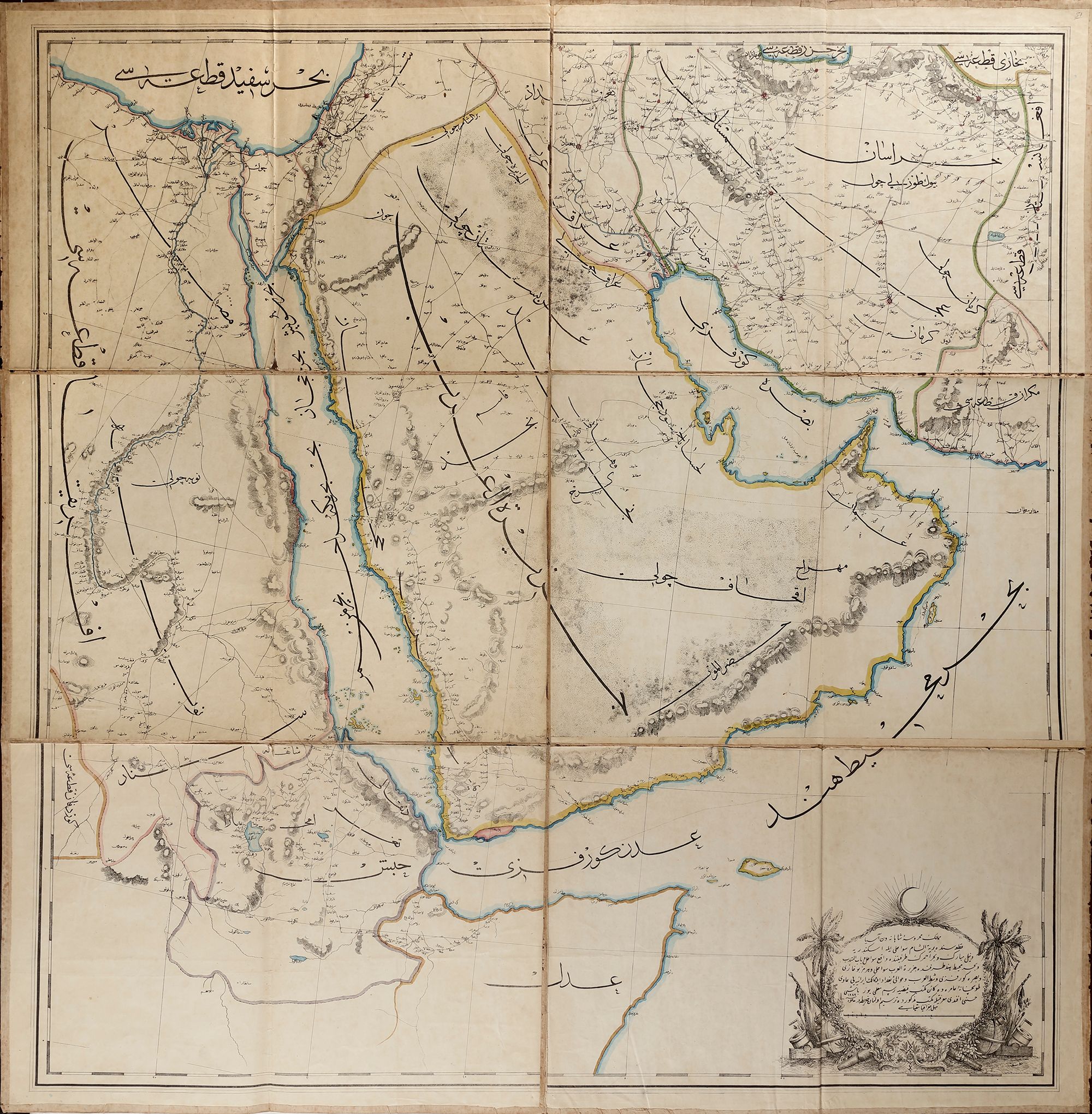 Map (2) A techno-colored map by Captain Hussni Efandi in Alfaythiya’s office at Tobkhana (the Royal Military Factory). It shows Baghdad, Basra Gulf, Arabian Peninsula’s costs, the Red sea side’s areas, and Yemen. Dated 1287 AH/1870 AD