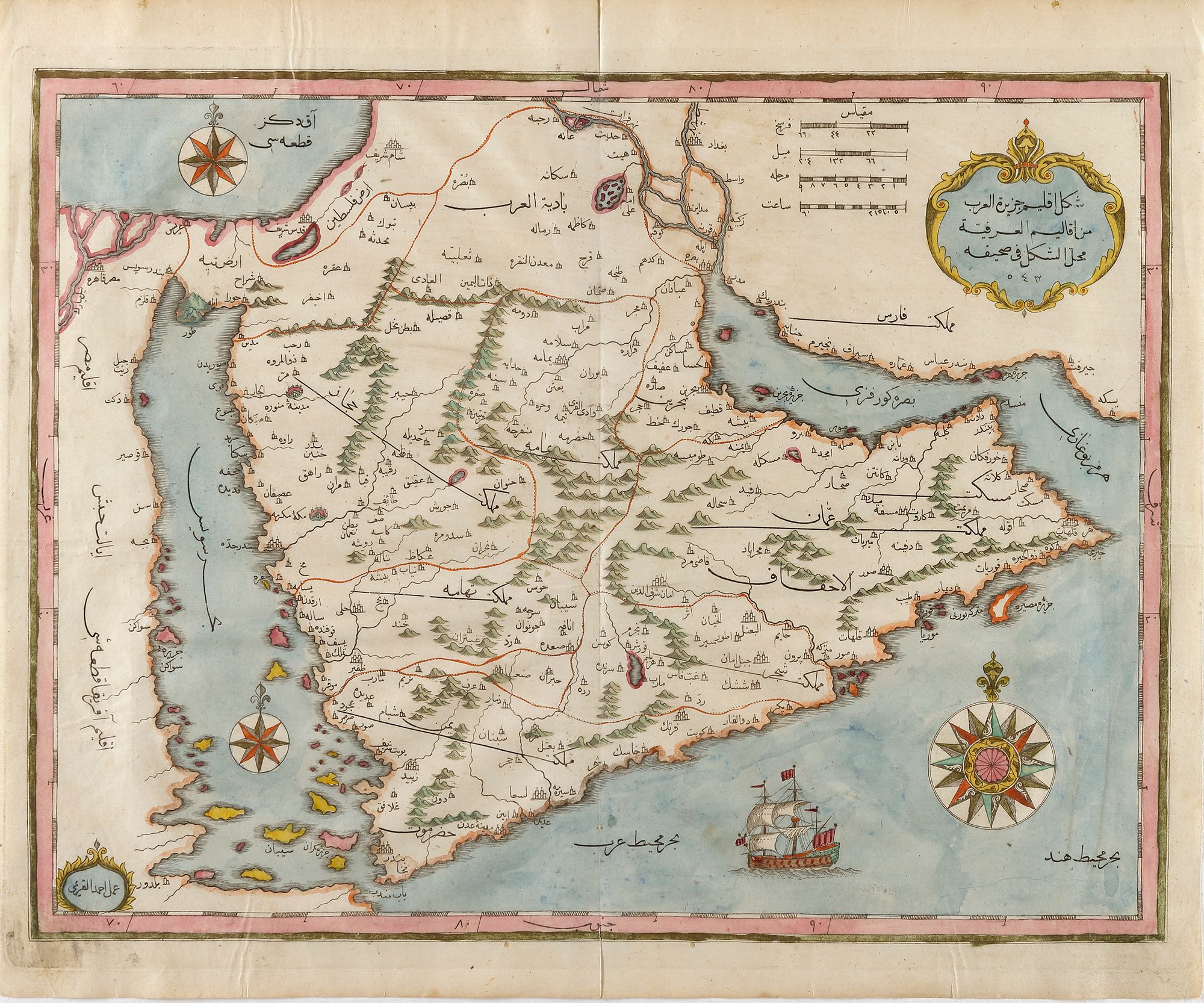 الخريطة الثالثة : خريطة إقليم جزيرة العرب ، خريطة منفردة من كتاب جهانما (مرآة العالم) الذي ألفه كاتب جلبي حاجي خليفة ، و طبعه إبراهيم متفرقة المجري في اسطنبول سنة 1145 هـ. و مطبعة متفرقة هي أول مطبعة للمسلمين قاطبة ، و قد طبعت 18 كتابا في دورتيها الأولى و الثانية : في حياة منشئها و بعد موته حتى سنة 1199 . كتاب جهانما هو أول كتاب جغرافي موعب يطبعه المسلمون ، و كان متفرقة قد طبع قبل الإعلان عن إنشاء المطبعة خريطتين جداريتين منفردتين ، ثم كتاب تحفة الكبار في أسفار البحار محتويا على أربع خرائط ، سنة 1142 هـ. و هو من تأليف كاتب جلبي أيضا . هذه الخريطة وضها أحمد القريمي (و عليها توقيعه) و ملونة باليد و محلاة بالذهب خلال عصر طباعتها . و تلاحظ البدائية في الطباعة و في أماكن المدن و المناطق على الخريطة و العجمة الشديدة في كتابة الألفاظ ، تشبه عجمة واضعي الخرائط الأوربيين للجزيرة العربية في القرنين السادس عشر و الخامس عشر .