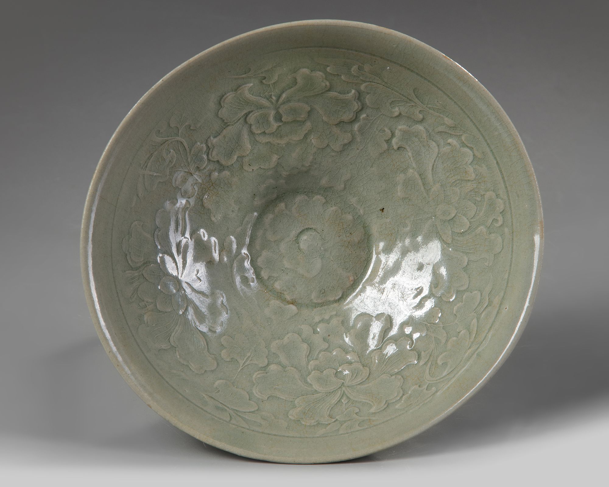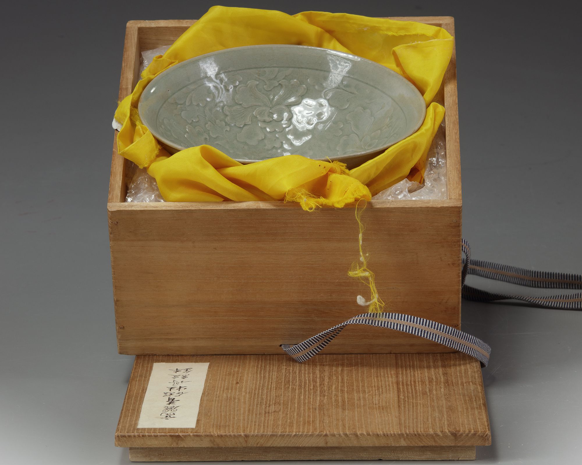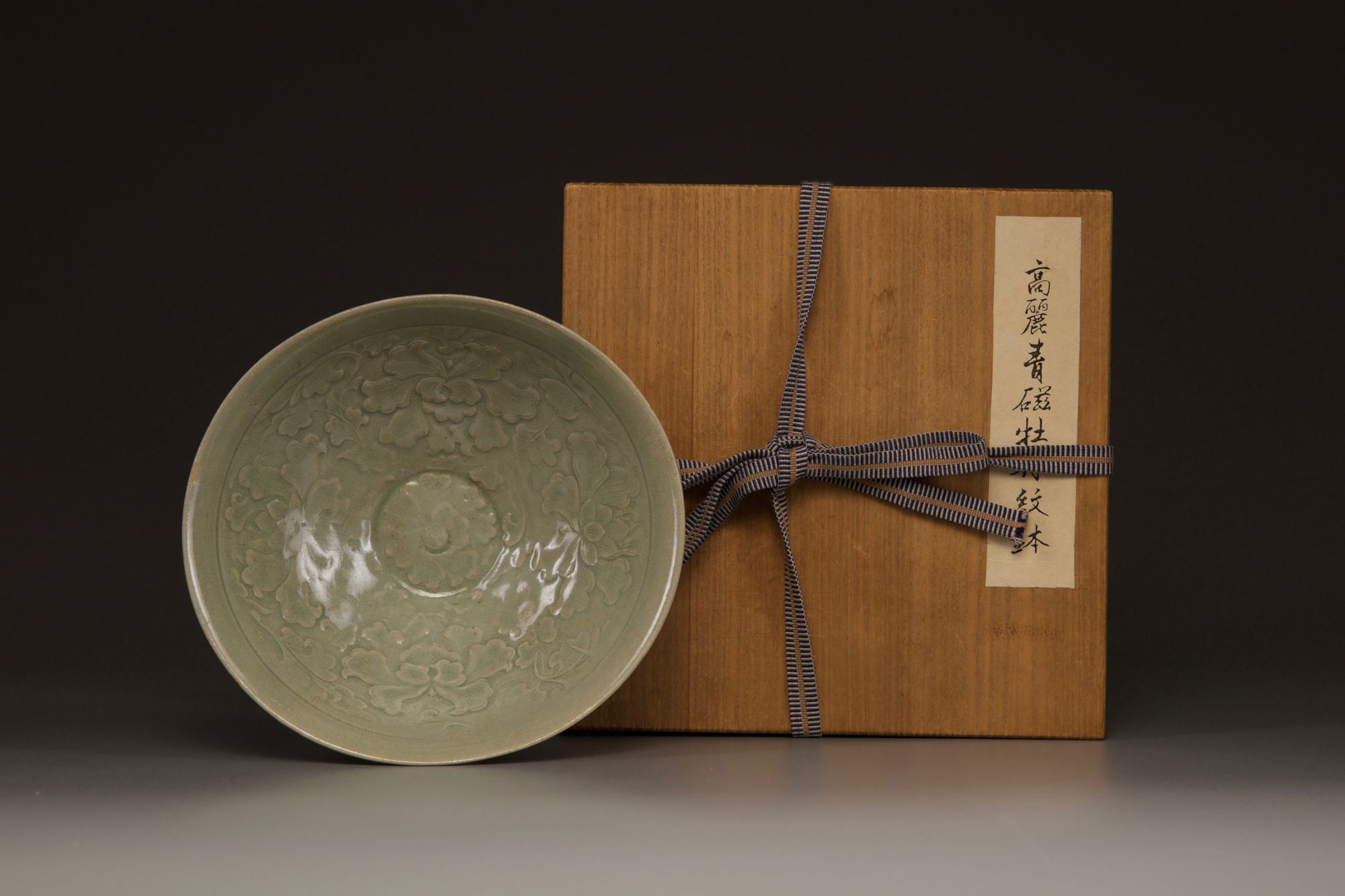 The interior finely decorated in relief with delicate stylised lotus blooms surrounding a central flower head roundel. It is covered overall with an olive green glaze. With a Japanese wooden box.