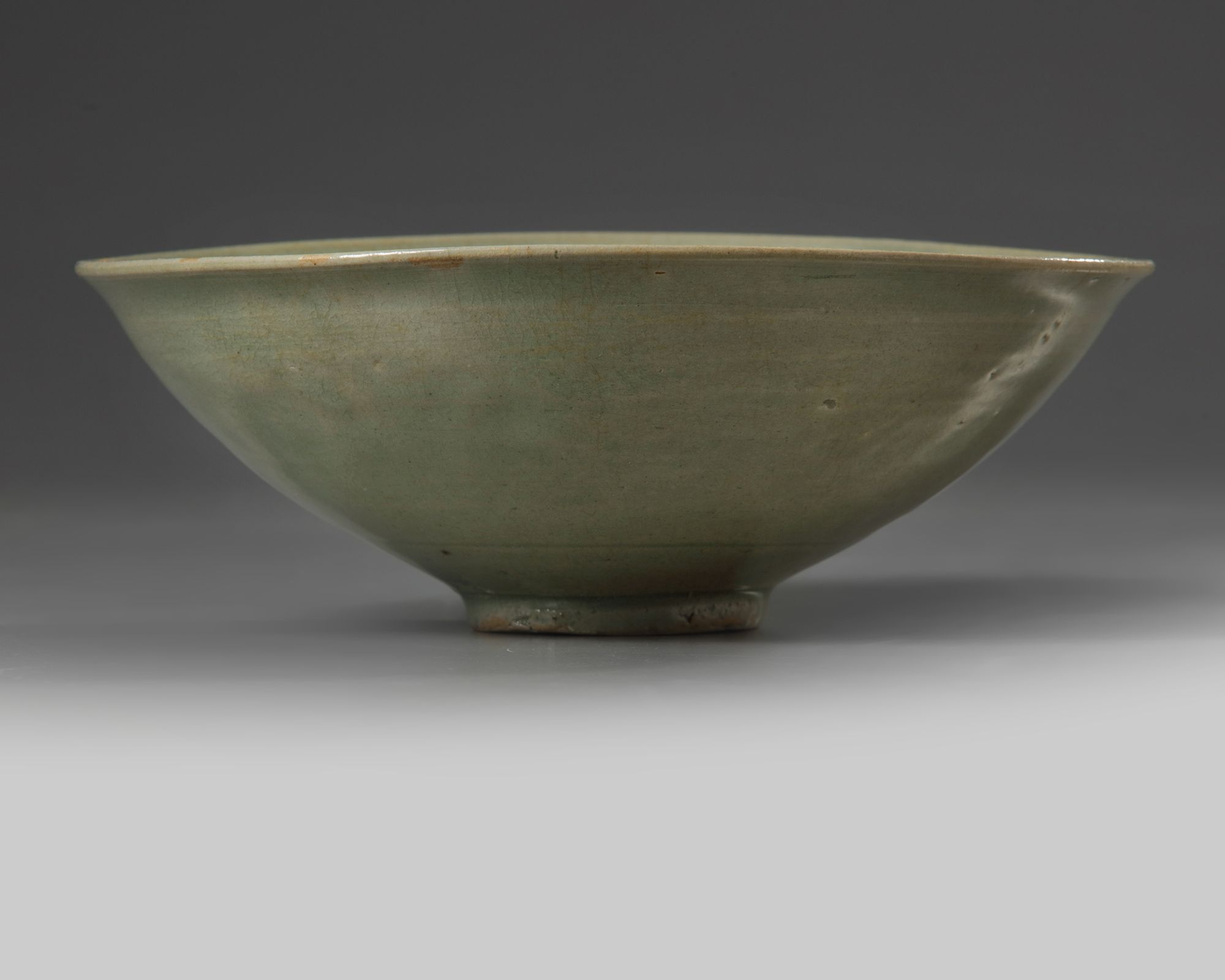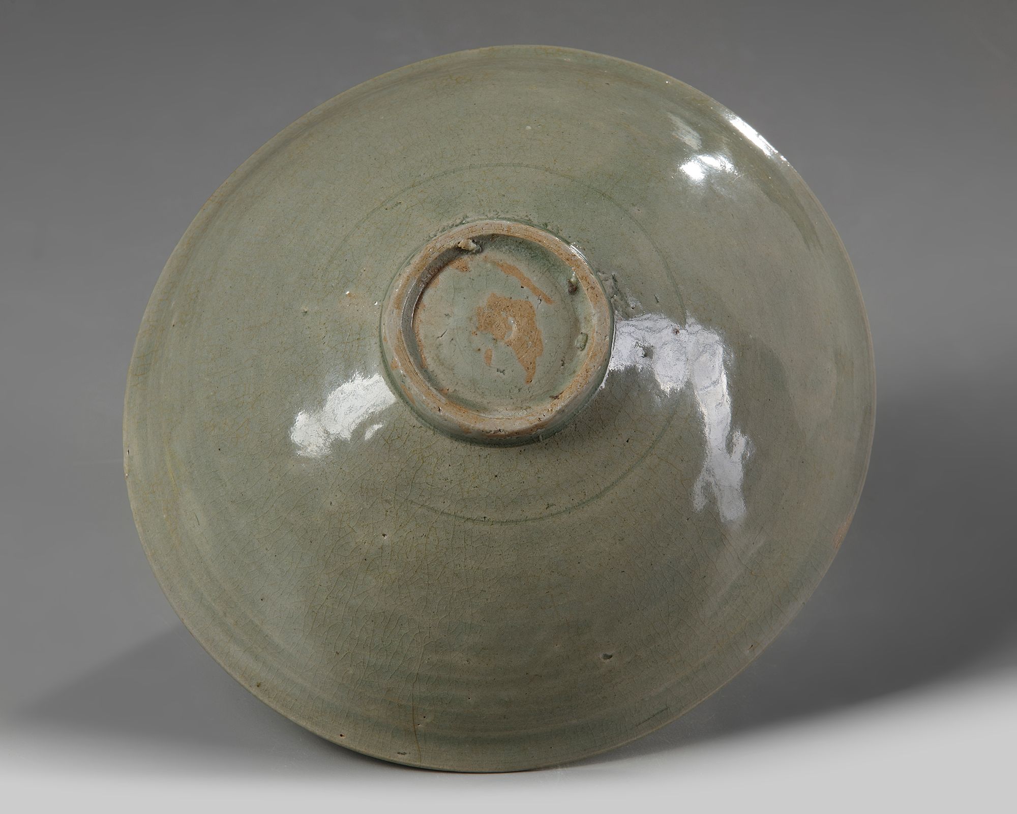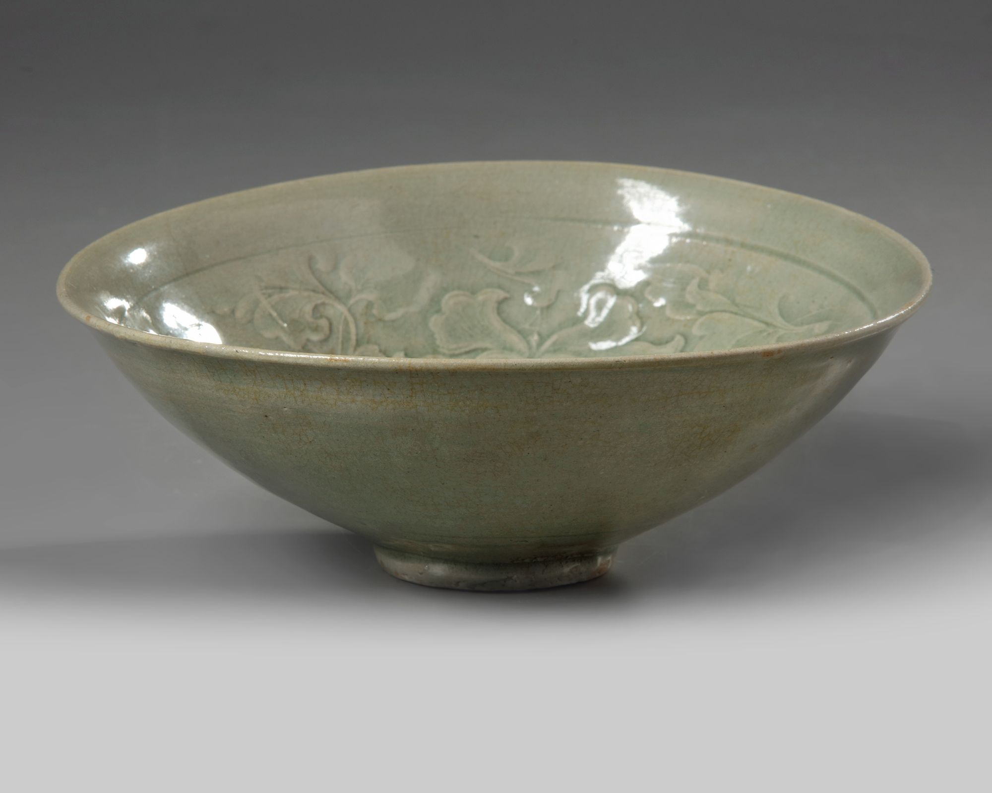 The interior finely decorated in relief with delicate stylised lotus blooms surrounding a central flower head roundel. It is covered overall with an olive green glaze. With a Japanese wooden box.