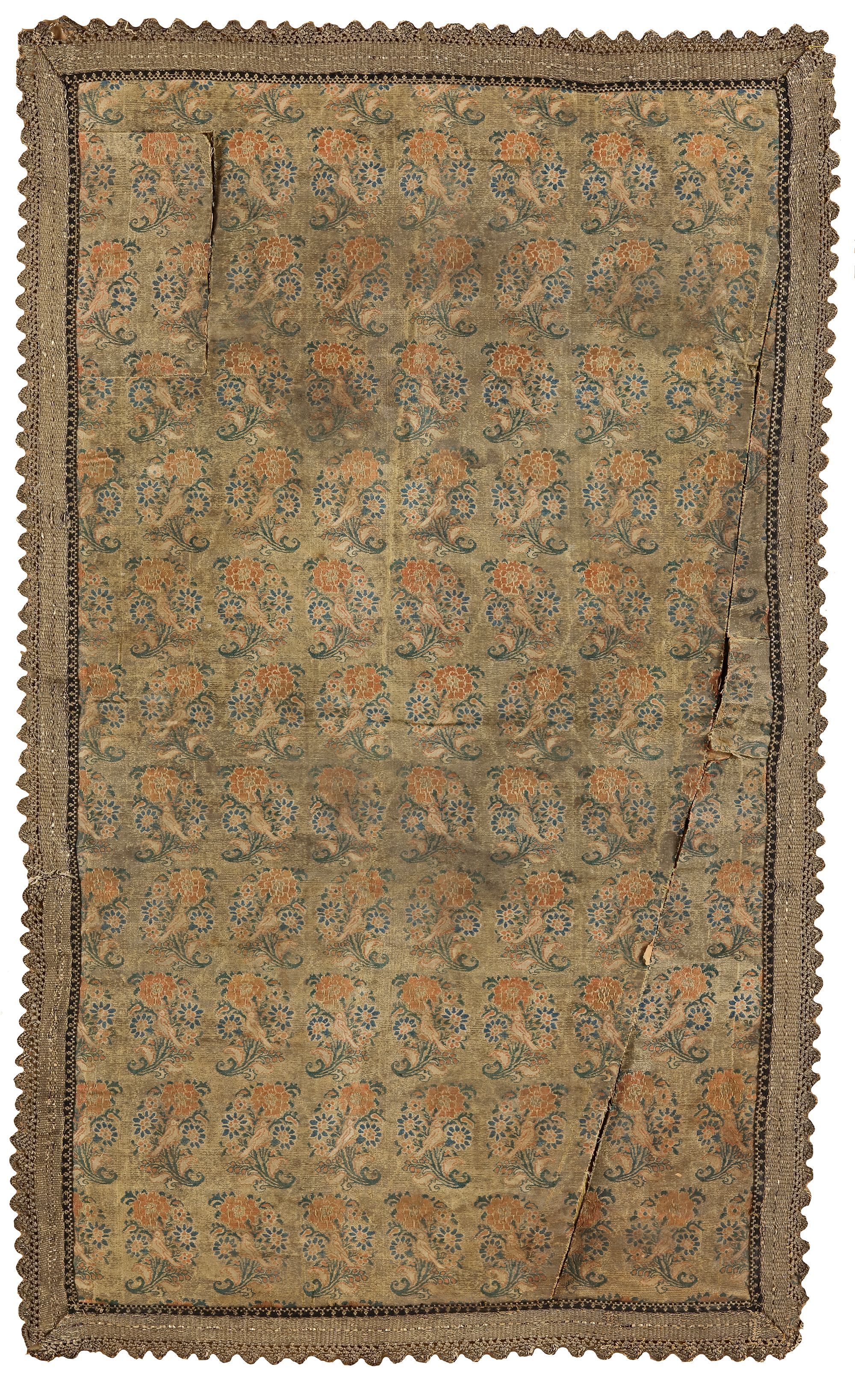 Decorated with a repeat design of orange and pink flowering plants with a perching parrot, with later metal thread border, lined with satin.