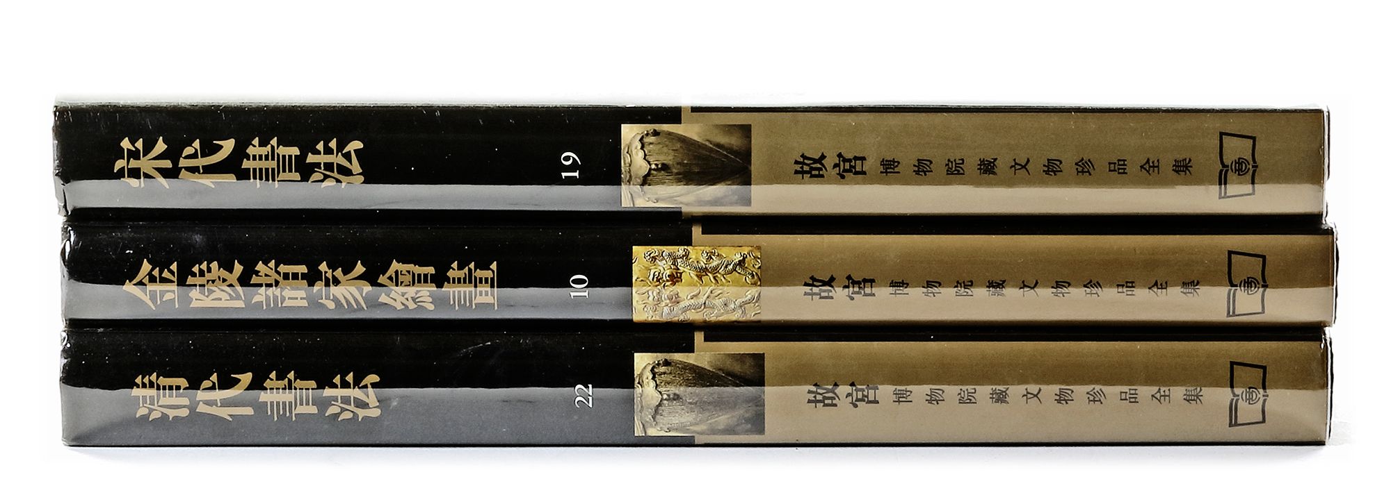 "Palace Museum The Complete Collection of the Treasures of the Palace Museum. Volume 19: Calligraphy of the Song dynasty Hong Kong: The Commercial Press, 2001. First Edition. 280 pages, over 100 items illustrated in colour. Text in Chinese, English captions. From the series of artefacts found in the Forbidden City also known as the Palace Museum. This volume illustrates over 100 works of Song dynasty calligraphy in the Palace Museum. Besides famous masters, there are other rare works by lesser-known painters as well. ; Palace Museum The Complete Collection of the Treasures of the Palace Museum: Volume 22: Calligraphy of the Qing Dynasty Hong Kong: The Commercial Press, 2001. First Edition. 277 pages, text in Chinese with English captions. 140 works illustrated. This volume illustrates 140 examples of calligraphy of the Ming dynasty in the collection of the Palace Museum, Beijing. Featured artists include Fu Shan, Wang Duo, Gong Xian, Zhu Da (Bada Shanren), Shitao, Zhou Lianggong, Wang Wenzhi, Jin Nong, Zheng Xie, Deng Shiru, Bao Shichen, He Shaoji, Zhao Zhiqian, among others. ; Palace Museum The Complete Collection of the Treasures of the Palace Museum: Volume 10: Paintings of the Jinling Region Hong Kong: The Commercial Press, 1997. First Edition. 294 pages. 120 items illustrated in colour, text in Chinese and English caption The collection of paintings from the Jinling regions (present-day Jiangsu-Nanjing) in the Palace Museum was assembled between 1950 and 1960, comprising works by various artists from the end of the Ming to the middle Qing dynasty. Among the prominent artists are Gong Xian, Fan Qi, Gao Cen, Wu Hong, Zho Zhe, Ye Xin, Xie Sun, and Hu Zao. ¶ Treasures of Imperial Court have captivated Chinese-culture lovers for decades. Various art forms' best treasures were selected from the thousands kept in the Palace Museum collection and shown in the series of books. Most of them are appearing in publication for the first time, with some not even having been seen publicly before. Each treasure has been catalogued and certified as genuine by the Palace, with details provided including the date it was added to the Palace collection, where it came from, its title, etc. This is an invaluable tool for those studying Chinese art from its earliest times as well as the Qing Dynasty in particular. The series, as it is now, comprises 60 volumes, each volume focussing on a specific art form and or time. Wonderfully photographed, these books are treasures in themselves."