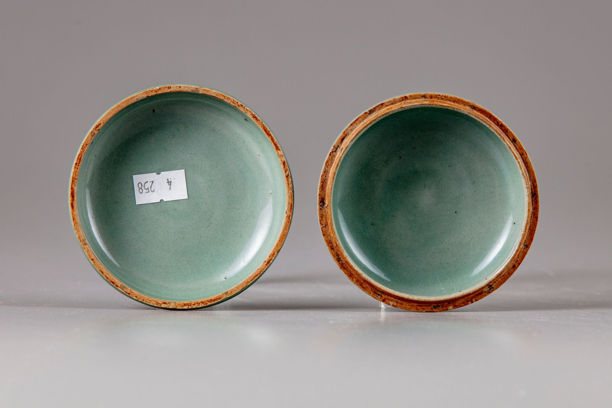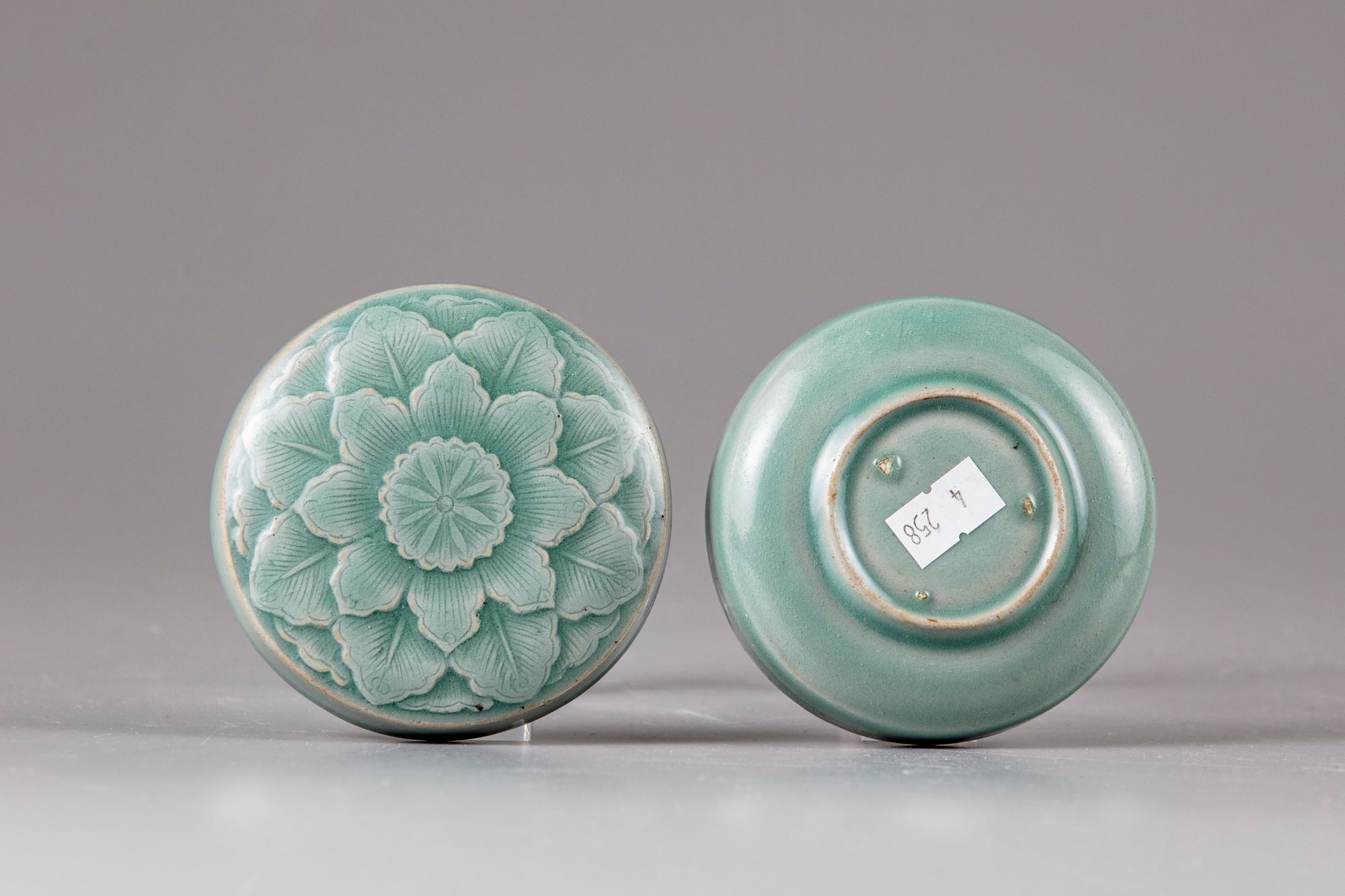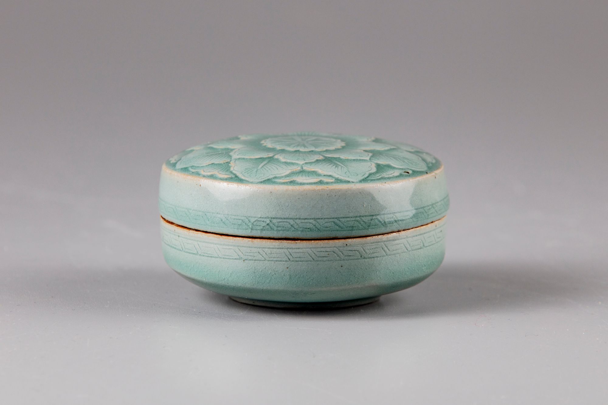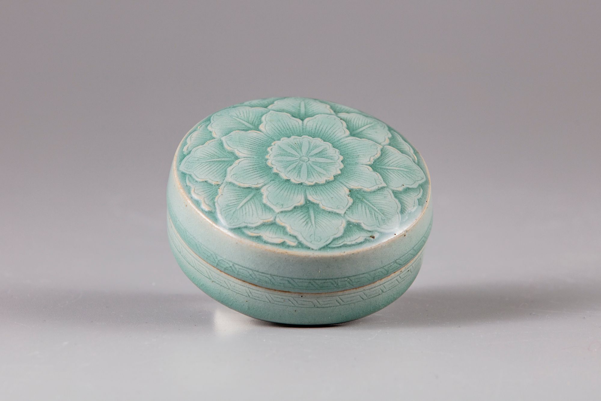 The circular cover is decorated with a flower head in low relief surrounded by leaves, the box standing on a small foot ring