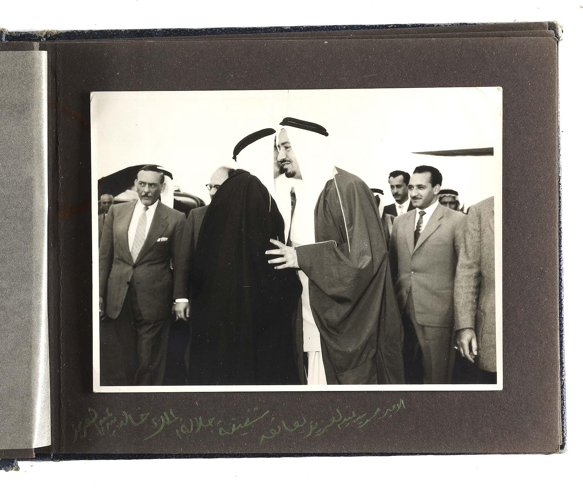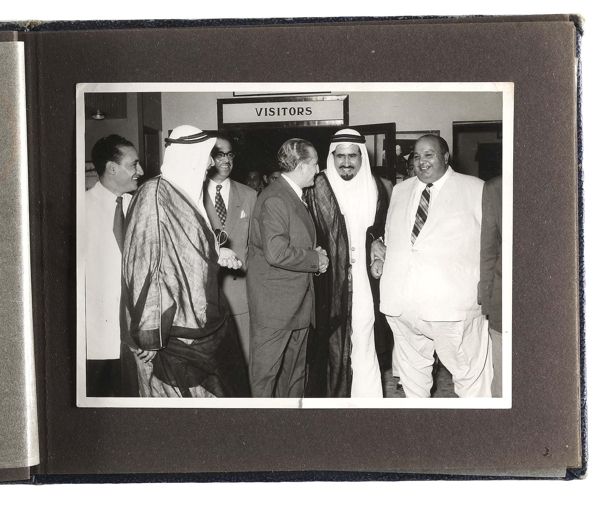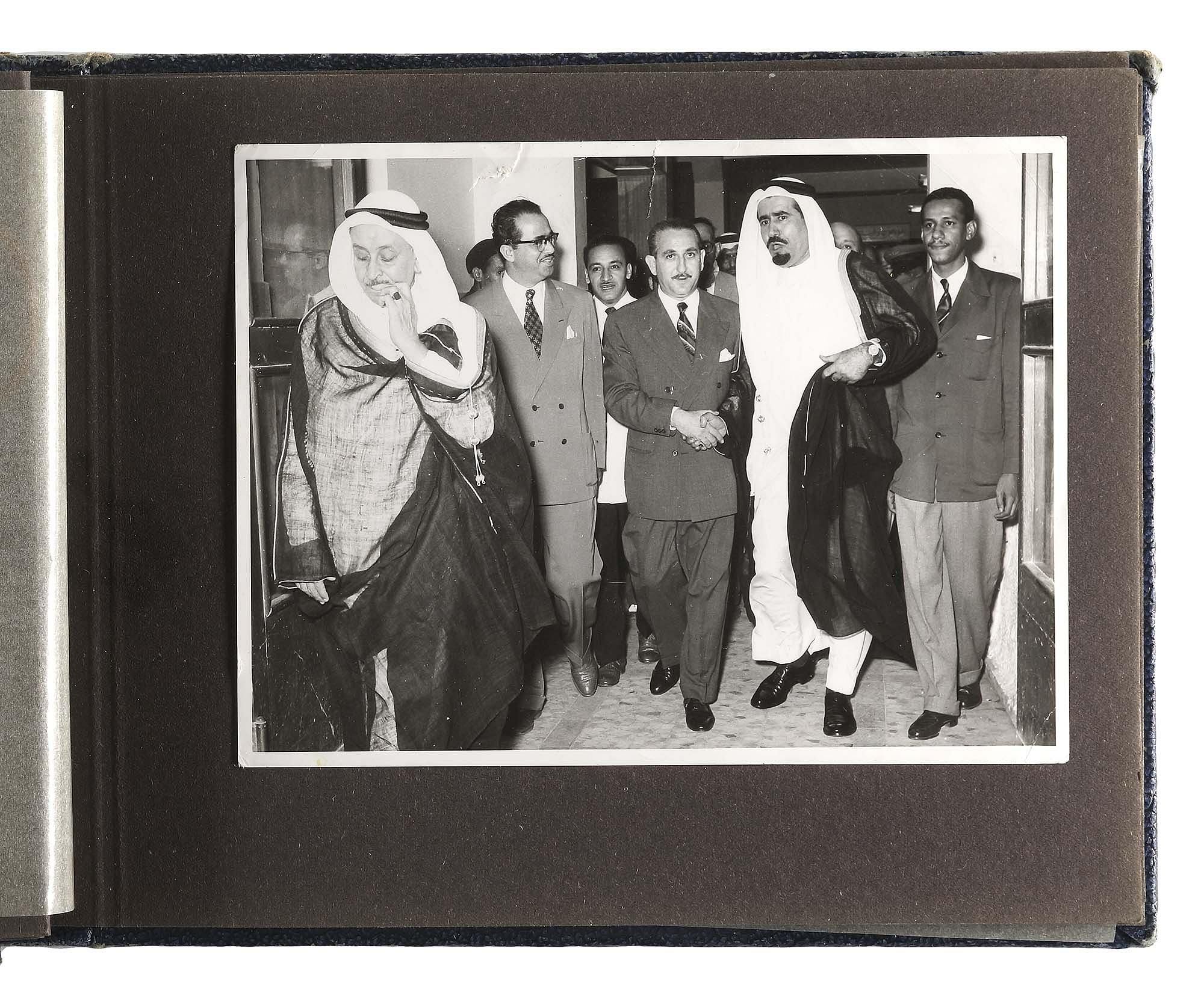 Prince Muhammad bin Abdul Aziz is the fourth son of King Abdul Aziz Al Saud. These photos were taken during one of his visits to Cairo accompanied by King Khalid bin Abdul Aziz, Prince Nasser bin Abdul Aziz, some of the princes of Al Saud residing in Cairo, the ambassador of the Kingdom of Saudi Arabia, republican presidential delegate Salah Al-Din Al-Shahid and others. 19 by 14.5 cm.