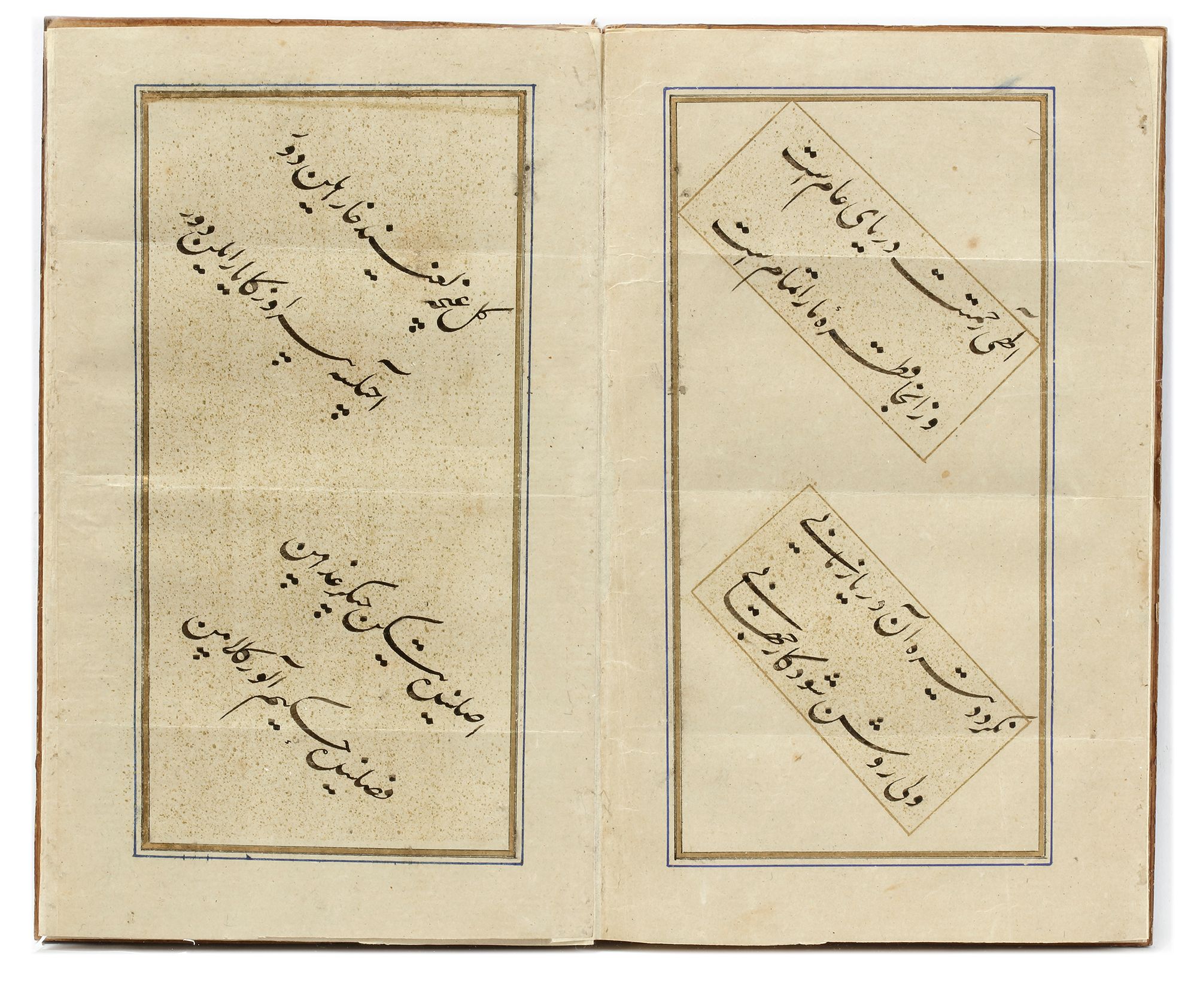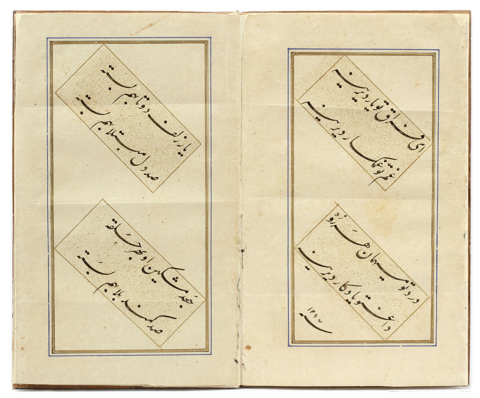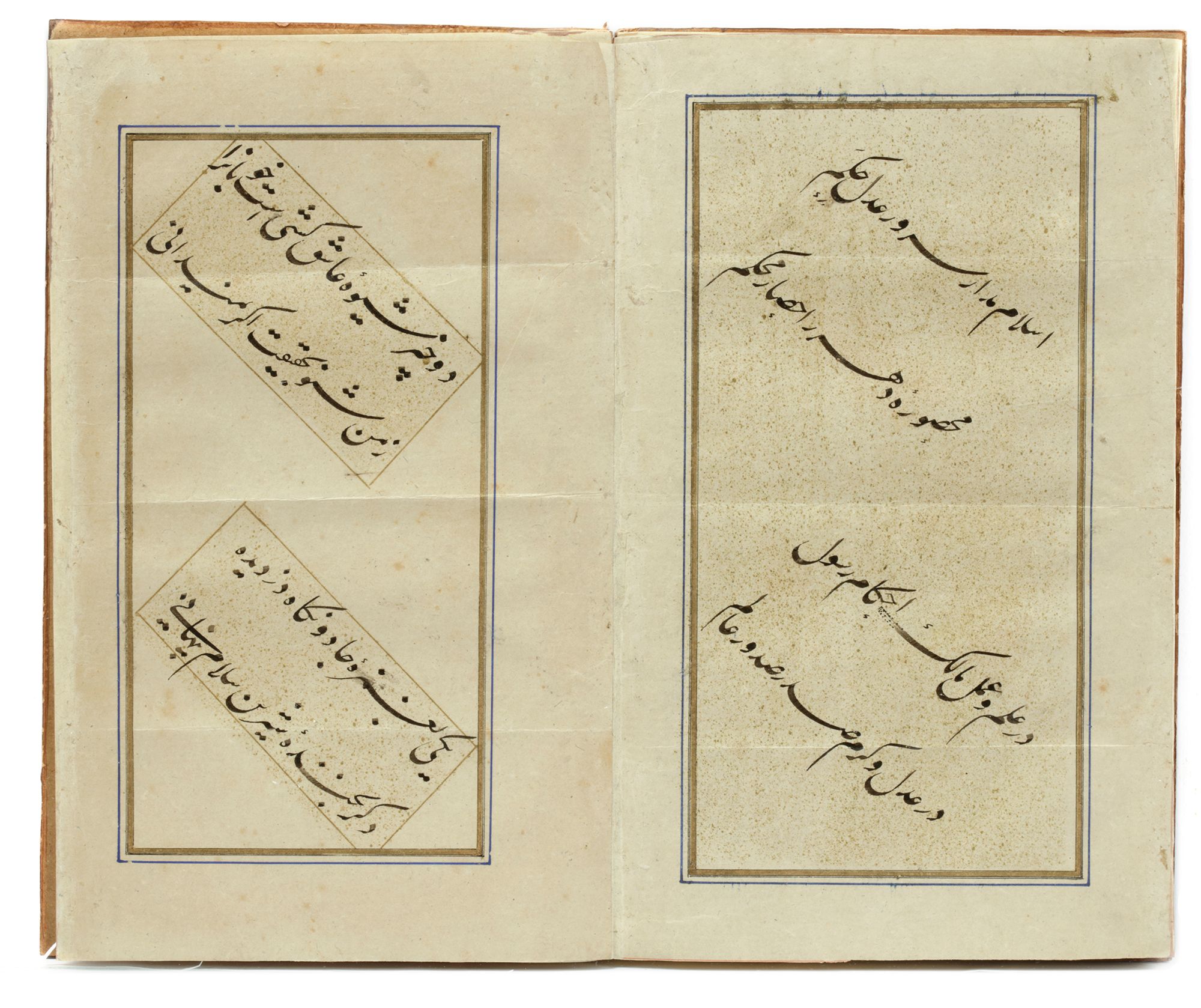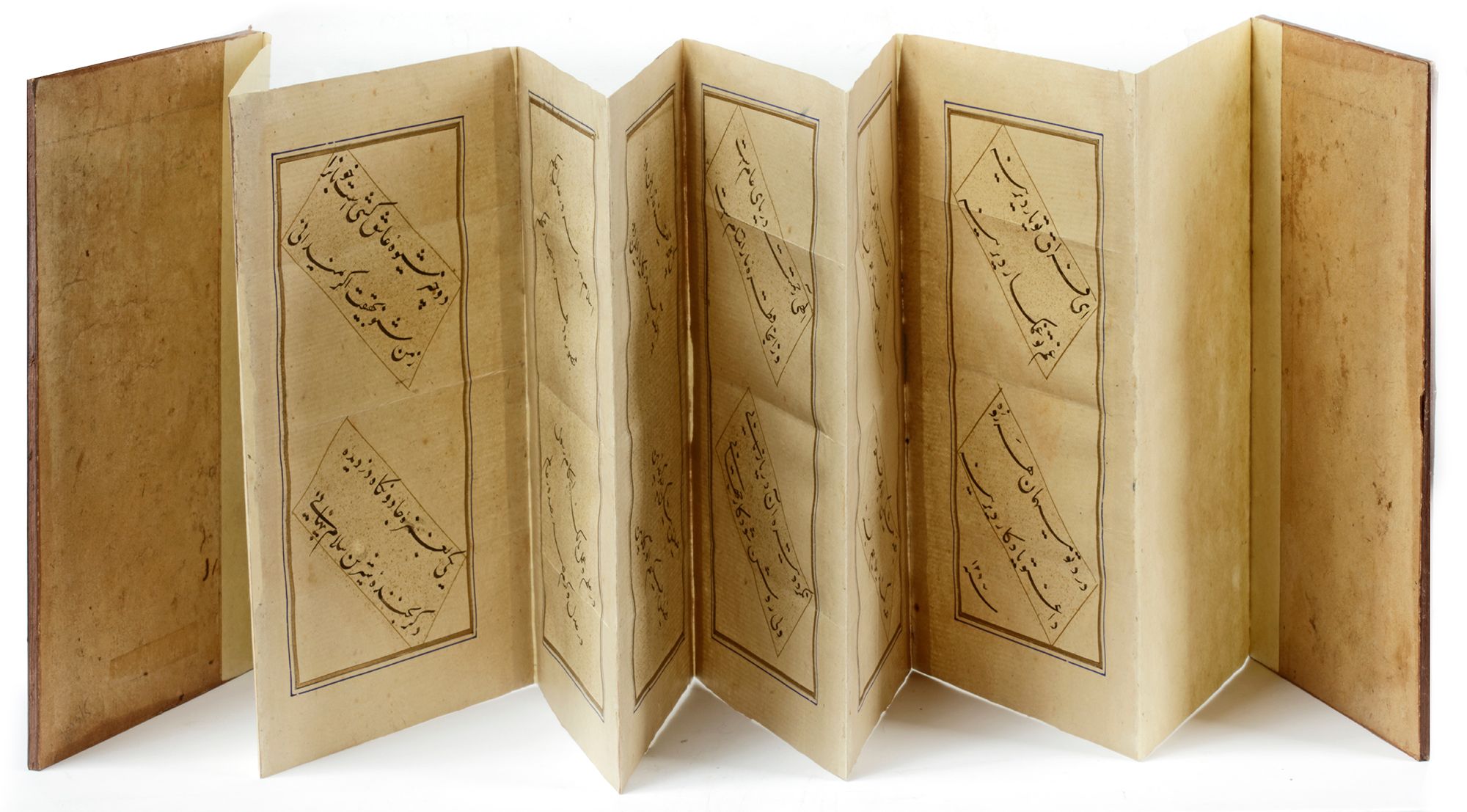 A concertina album of six pages of Persian couplets in nasta'liq calligraphy on gold-sprinkled paper. Red leather binding. 23.2 cm. by 14 cm.