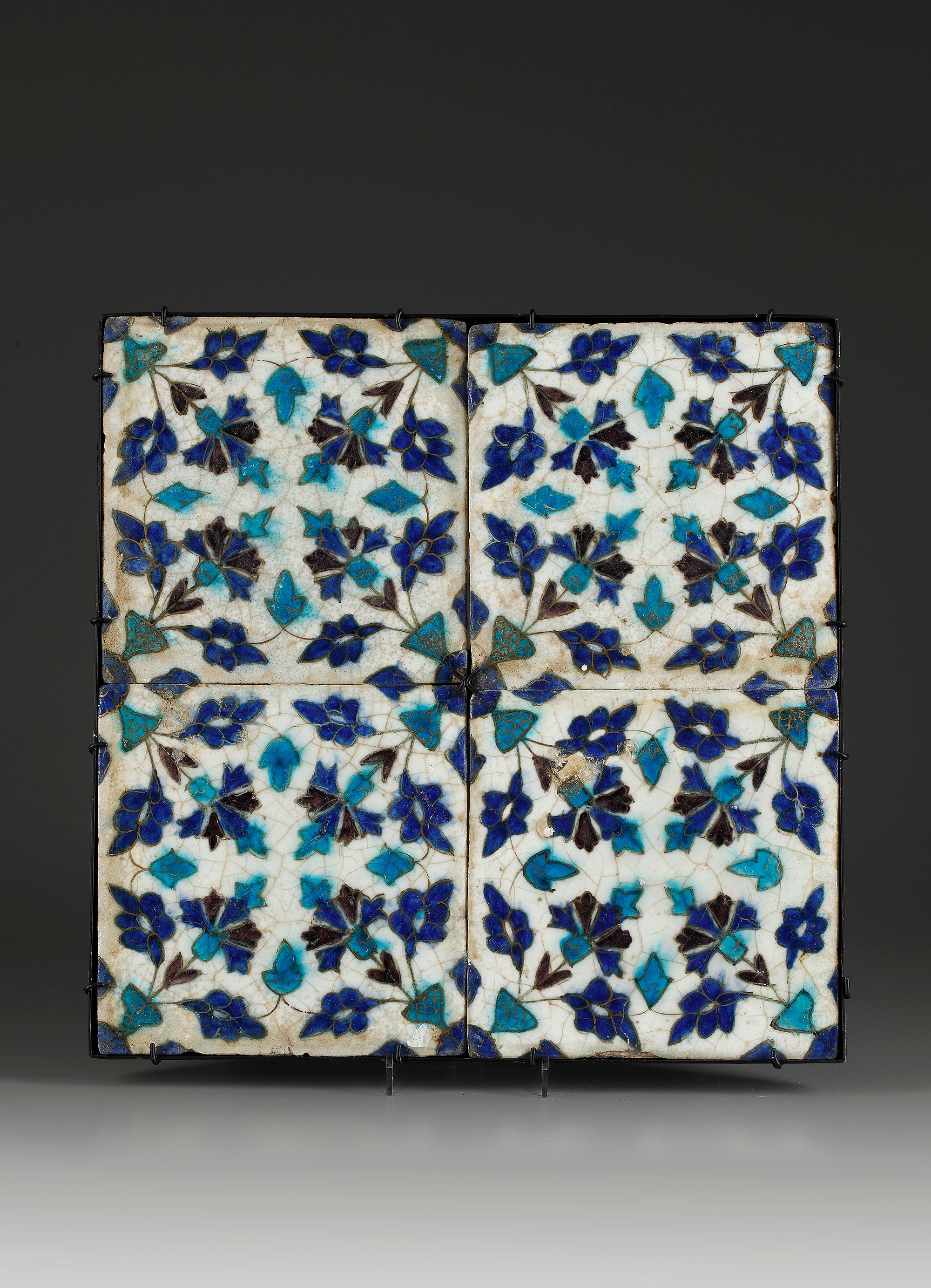 أربع بلاطات حجرية مزخرفة دمشق سوريا تعود للقرن السابع عشر مربعة الشكل مزخرفة بأزهار باللون الأزرق الغامق ,التركوازي و الأسود على خلفية بيضاء