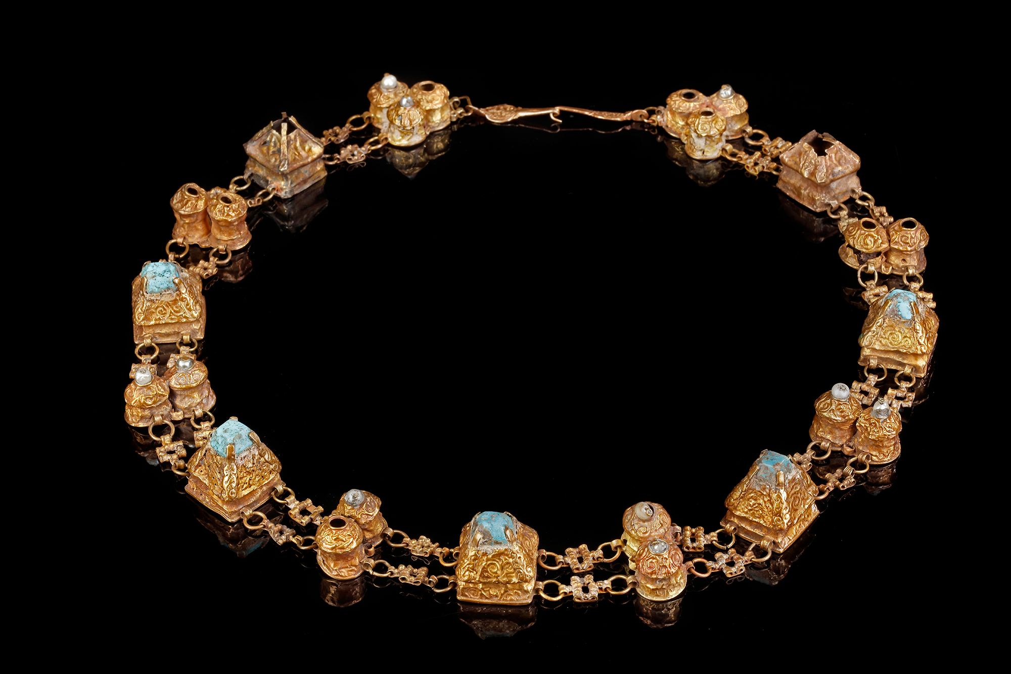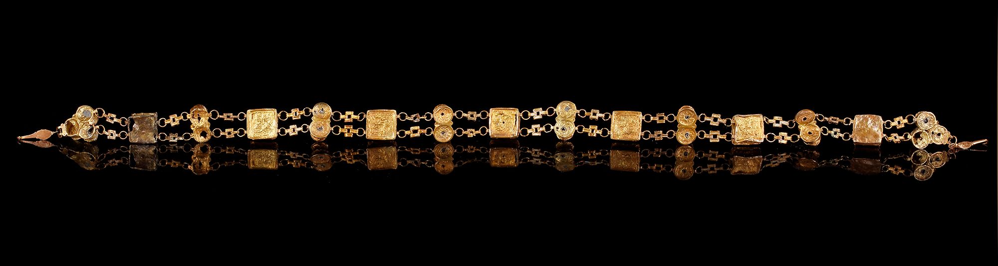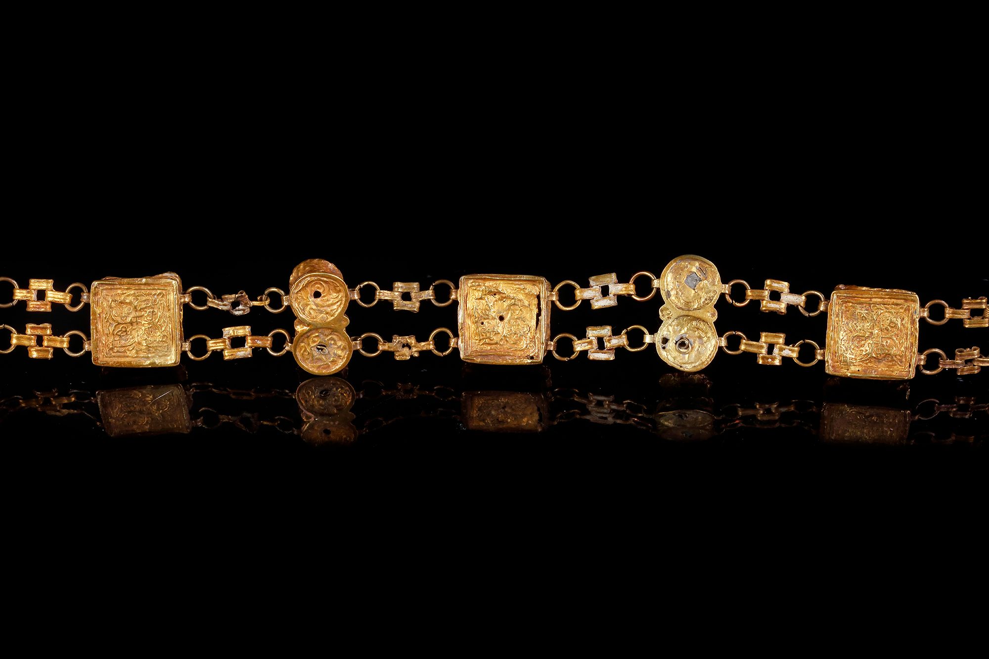 This is one of the most substantial and unusual examples of Seljuk jewellery to be offered at auction in recent times. It combines a strength in design with a sophistication in manufacture. The foliate decoration, the shape of the elements, the form of the clasp are all familiar from recorded examples of Seljuk jewellery. The use of bands of interconnected links to join the elements is less common. Several examples of bands formed in this way have been discovered. A bracelet formed entirely of such a band was published by Popescu and thought to be of Balkan origin and date from the fourteenth century (Popescu 1970, p.56, no.84). Another bracelet of related form was attributed to the Ottoman Empire sometime in the fourteenth to sixteenth centuries (Spink and Son 1986, p.62, no.68). A further example in the National Museum in Damascus was believed to originate in northern Syria and to date from the twelfth or thirteenth century. The combination of the elements, drawing on a more readily identifiable Persian Seljuk style, linked by bands associated with the area extending from the Balkans through Anatolia to northern Syria suggests that the origin of this piece of jewellery may be from the Rum Seljuk tradition.