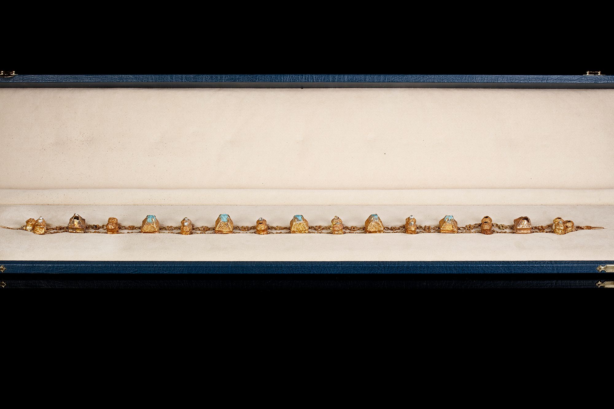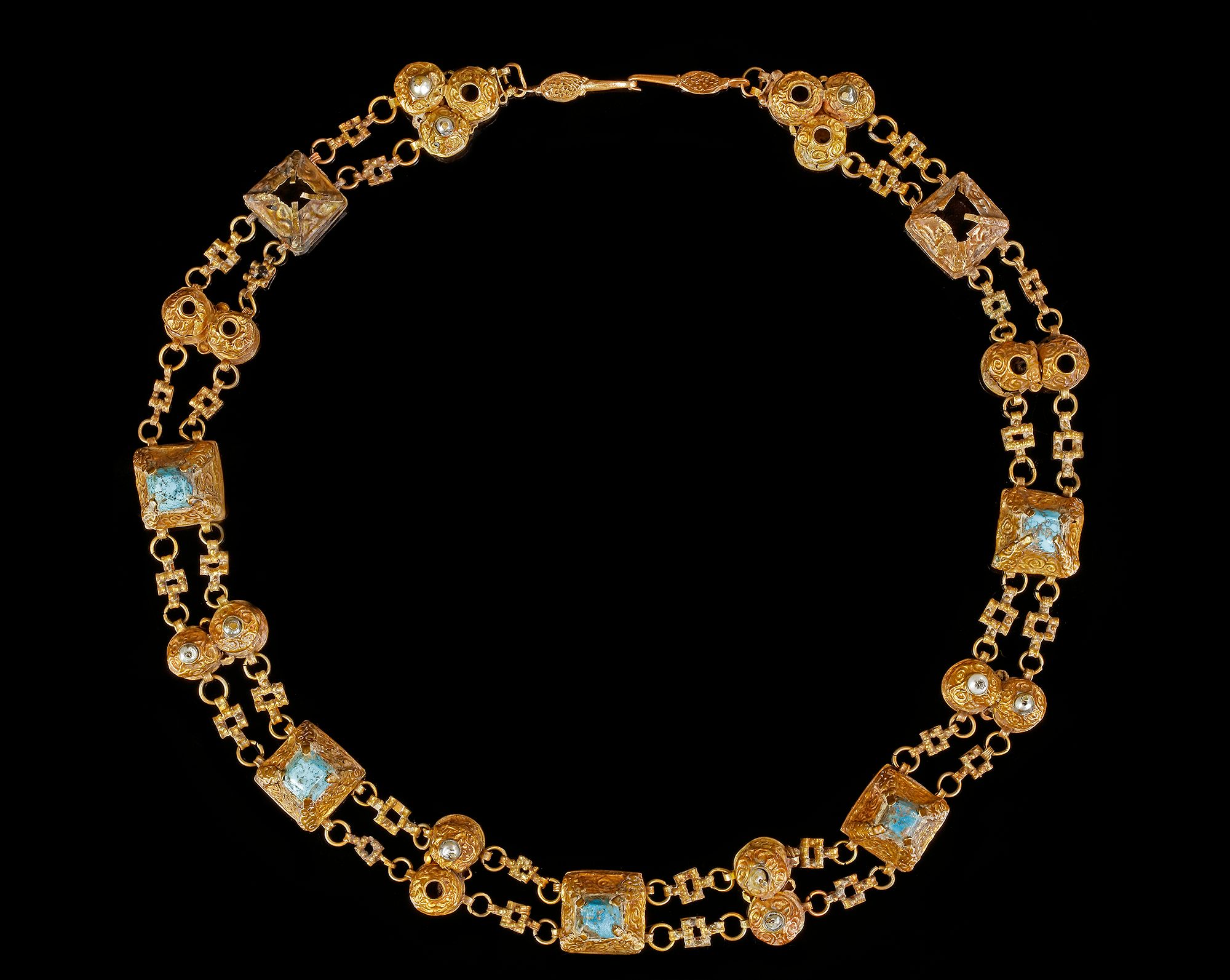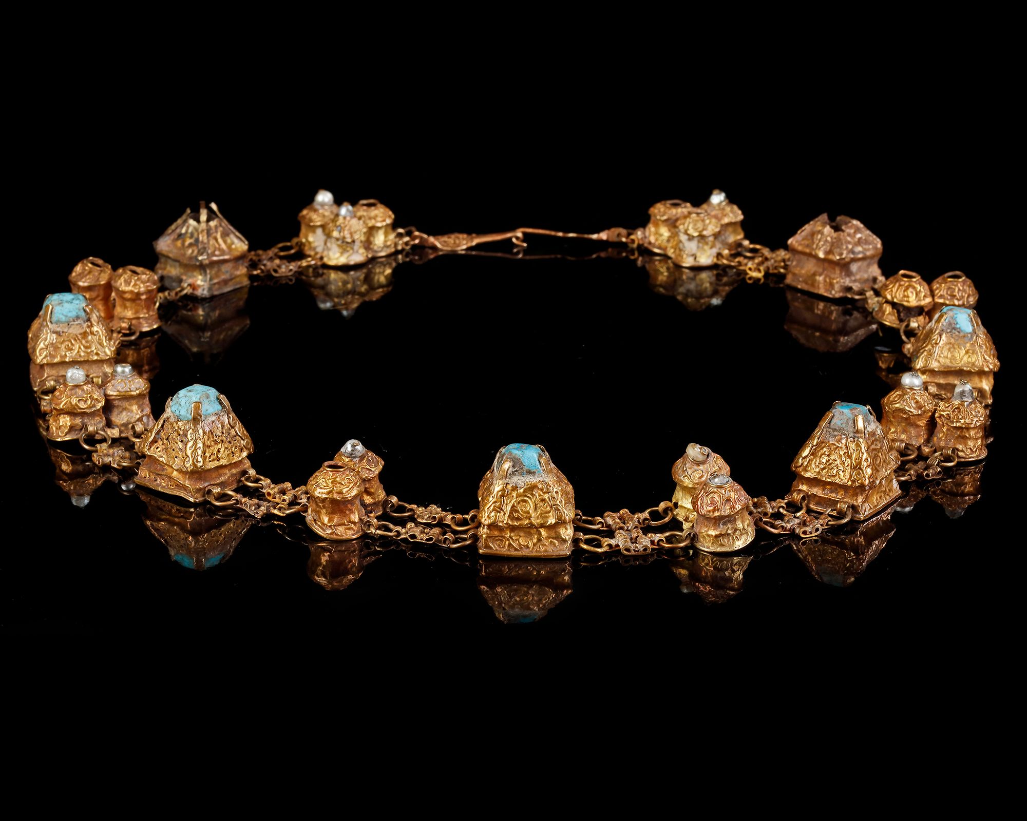 This is one of the most substantial and unusual examples of Seljuk jewellery to be offered at auction in recent times. It combines a strength in design with a sophistication in manufacture. The foliate decoration, the shape of the elements, the form of the clasp are all familiar from recorded examples of Seljuk jewellery. The use of bands of interconnected links to join the elements is less common. Several examples of bands formed in this way have been discovered. A bracelet formed entirely of such a band was published by Popescu and thought to be of Balkan origin and date from the fourteenth century (Popescu 1970, p.56, no.84). Another bracelet of related form was attributed to the Ottoman Empire sometime in the fourteenth to sixteenth centuries (Spink and Son 1986, p.62, no.68). A further example in the National Museum in Damascus was believed to originate in northern Syria and to date from the twelfth or thirteenth century. The combination of the elements, drawing on a more readily identifiable Persian Seljuk style, linked by bands associated with the area extending from the Balkans through Anatolia to northern Syria suggests that the origin of this piece of jewellery may be from the Rum Seljuk tradition.