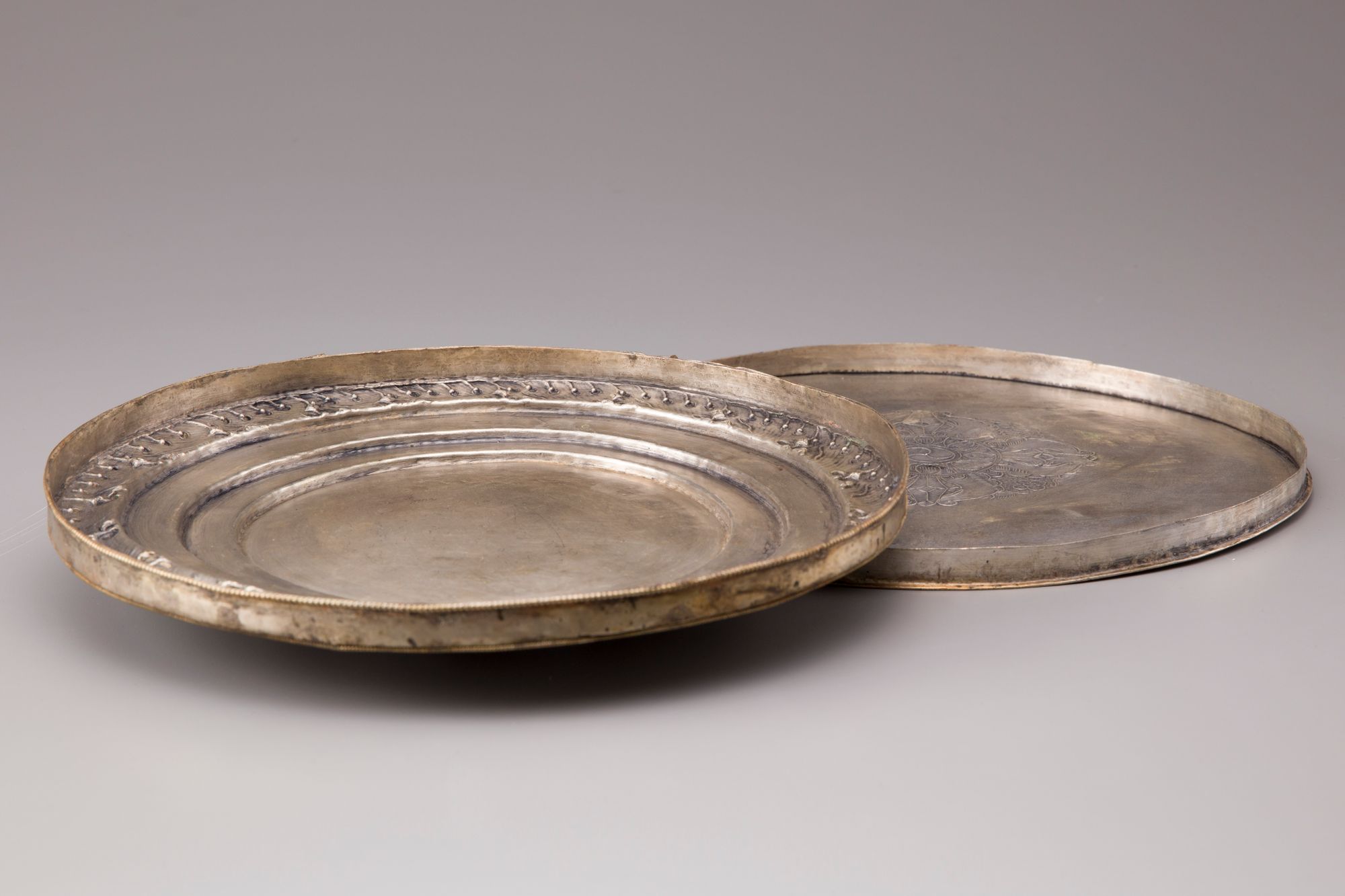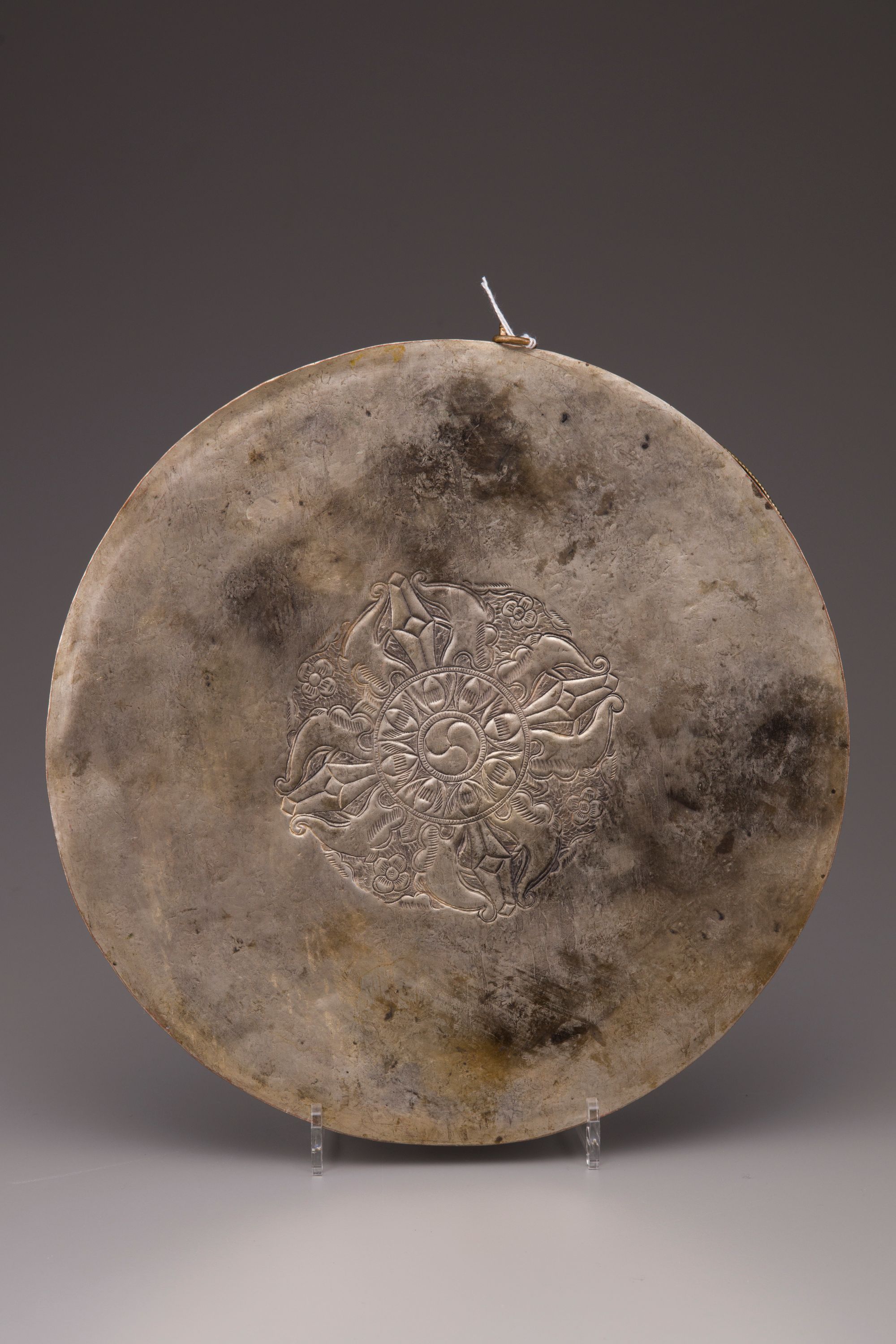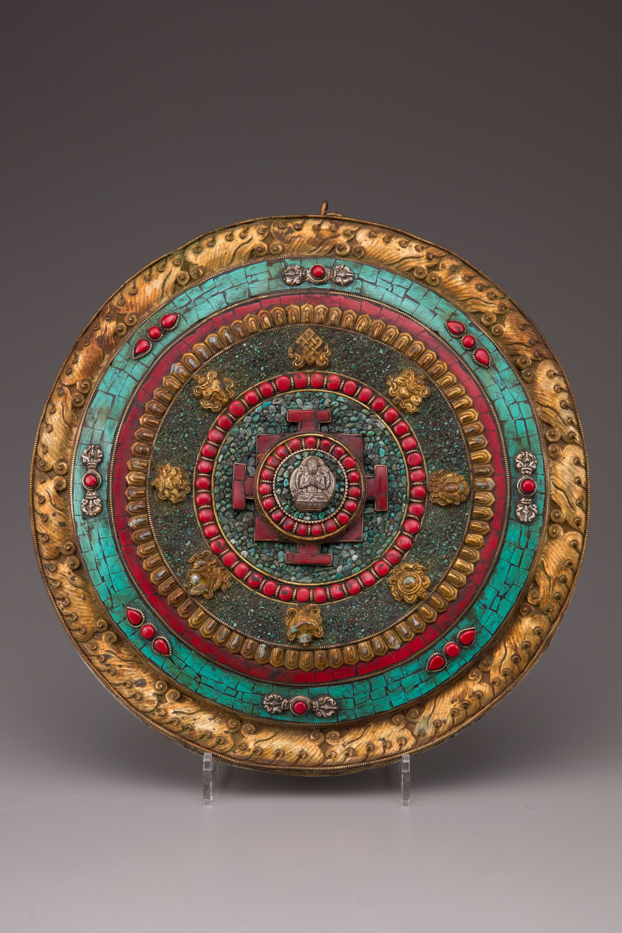 Round lidded silver box, in the shape of a Mandala and decorated with semi-precious stones and the 8 auspicious Buddhist emblems.