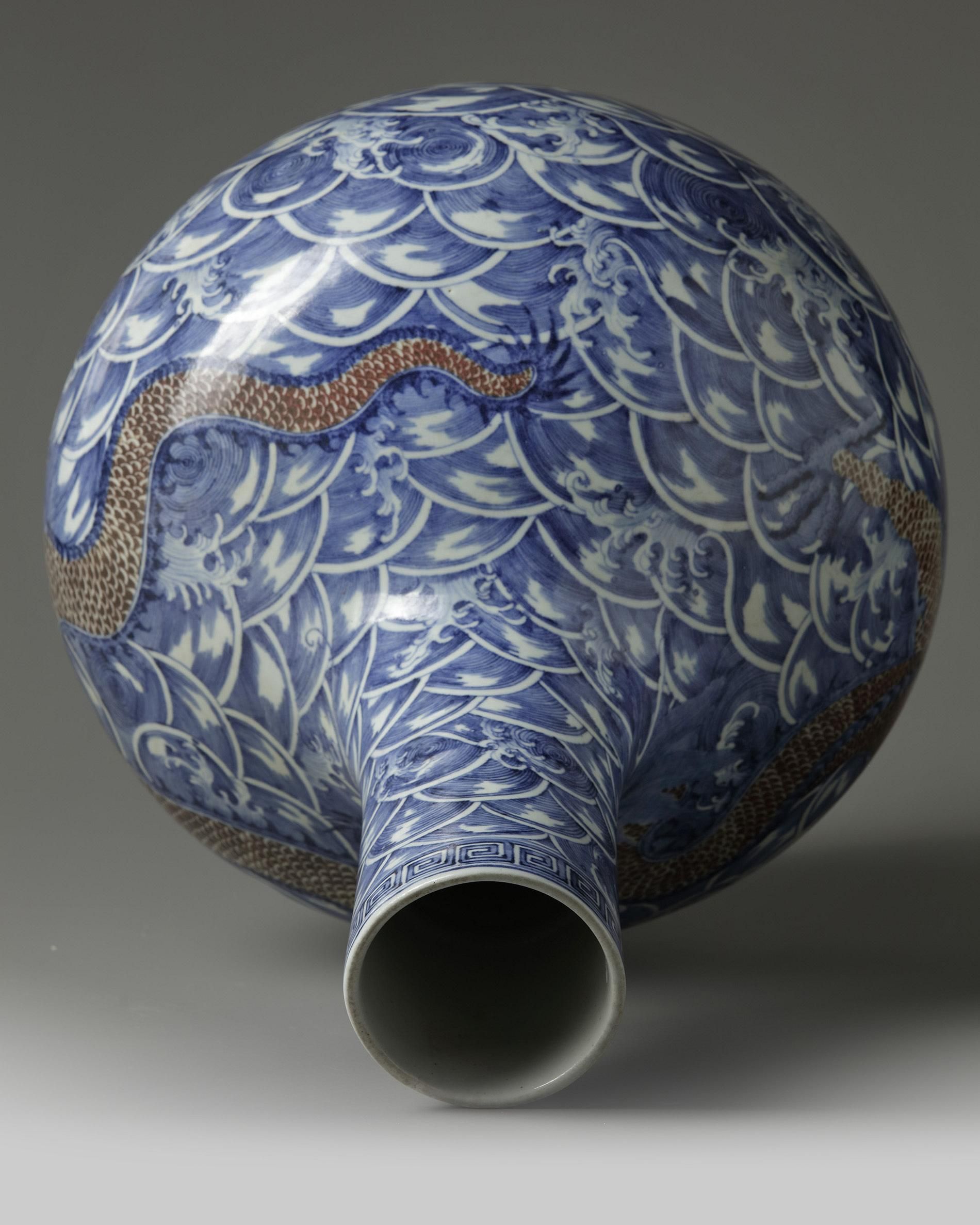 The vase is decorated with a bold writhing dragon with scales in underglaze copper red which winds itself around the body and up the neck, all on a ground of densely foaming waves. The rim is decorated with a keyfret band and the base is unglazed.