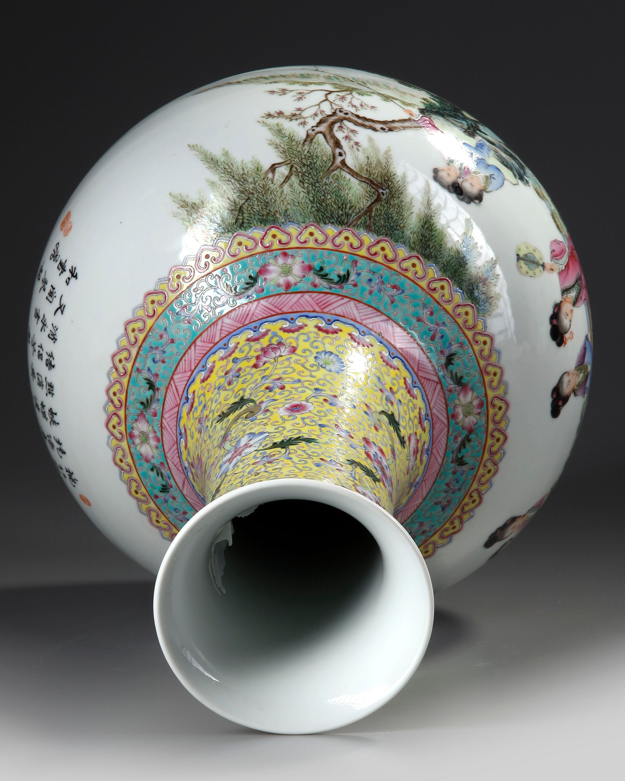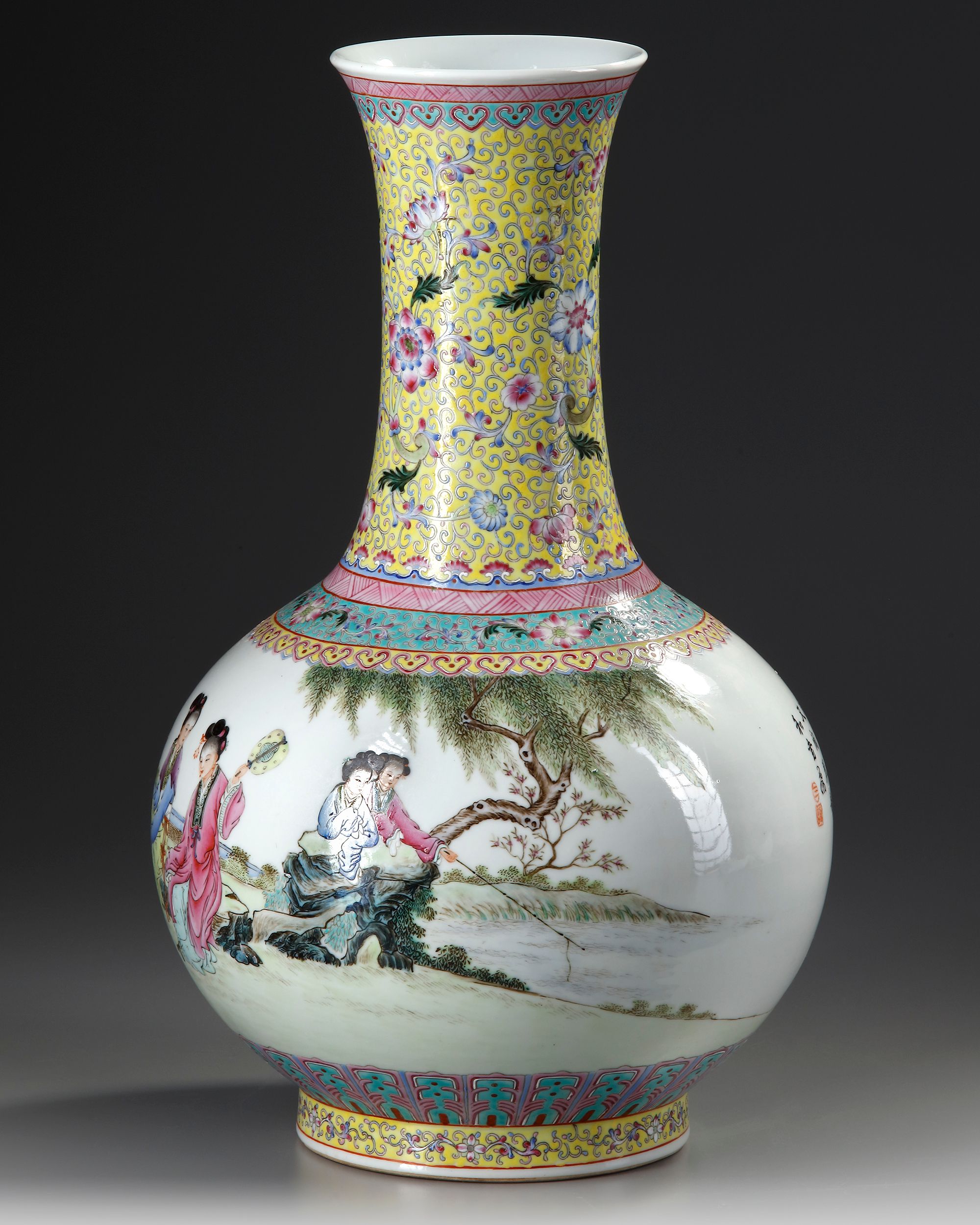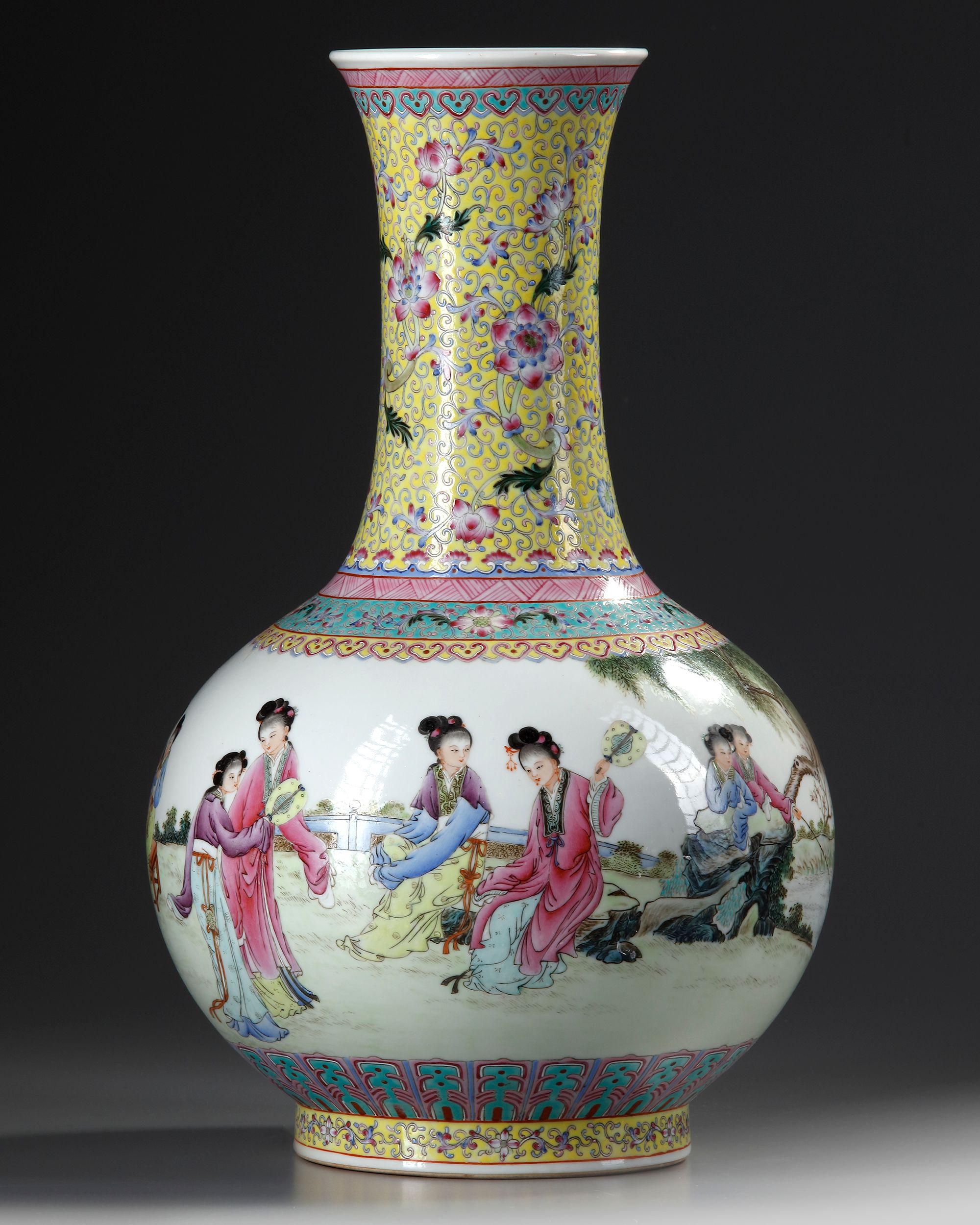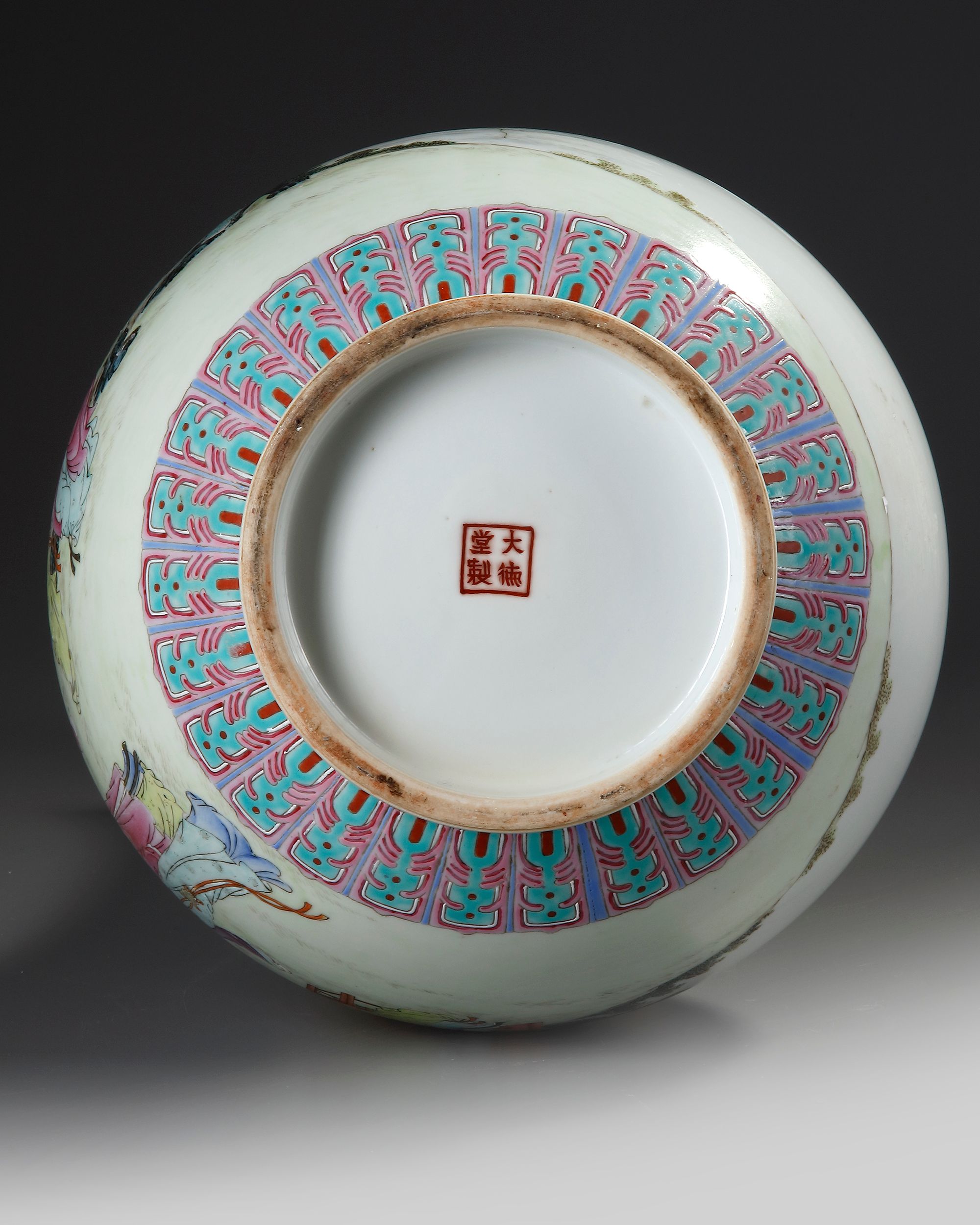 Painted with ladies under a blossoming tree in a garden, inscriptions to the other side.