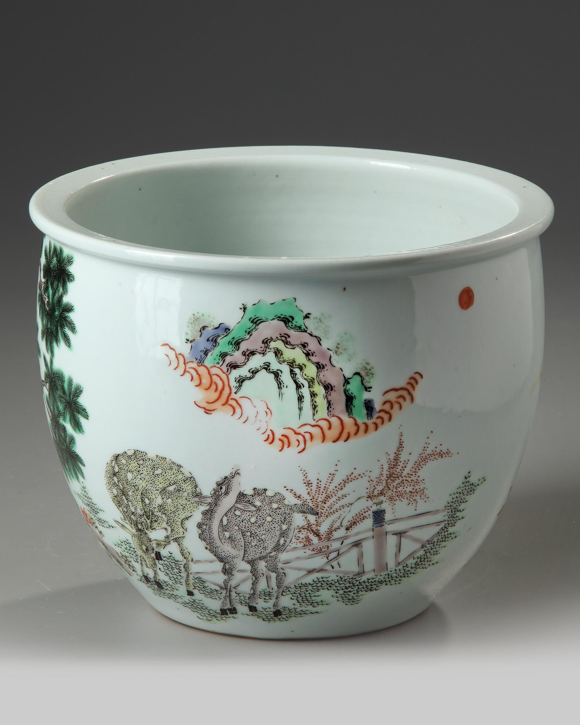 Decorated in famille verte enamels with Zhong Kui with a demon, two deer beside a large pine tree in a fenced garden. Height: 17 cm. Diameter: 22 cm.